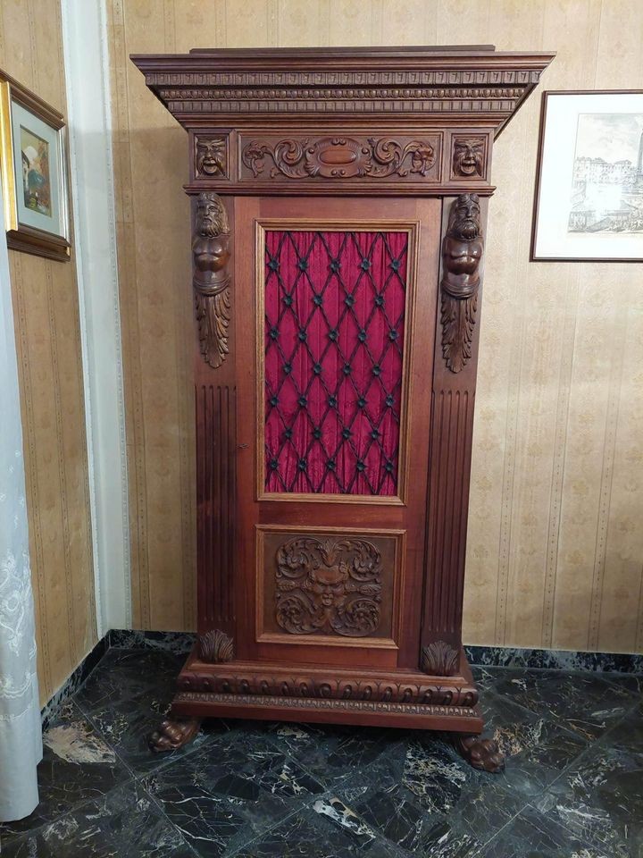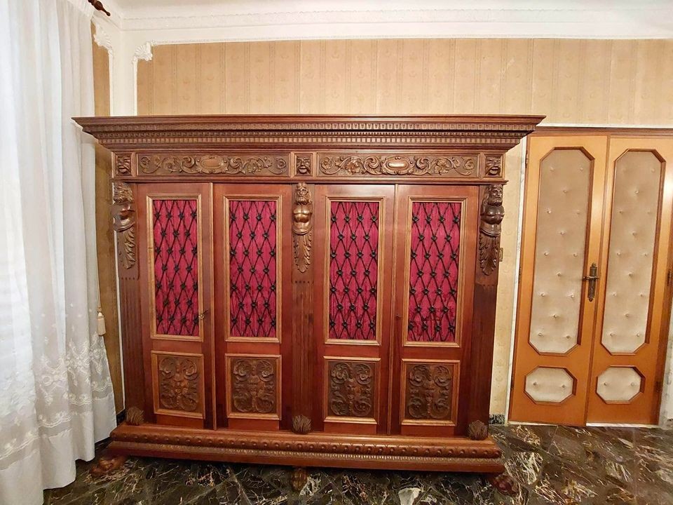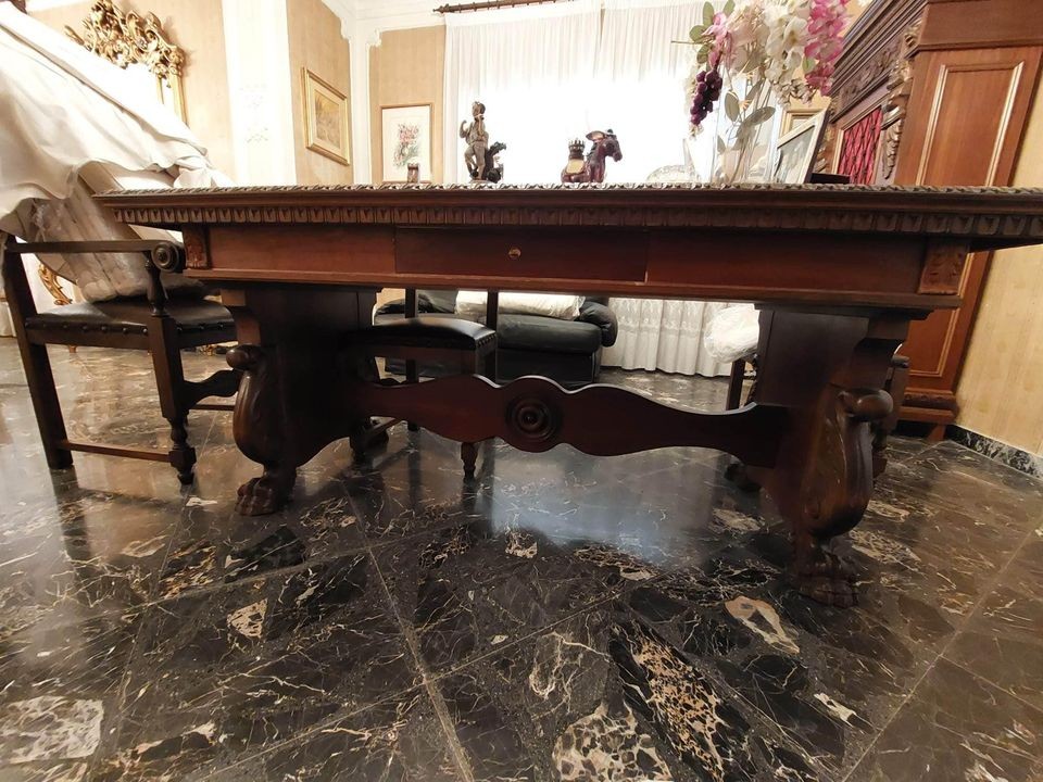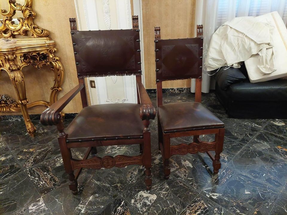 W skład drewnianego kompletu wchodzą: 4-drzwiowa biblioteka, 1-drzwiowa biblioteka, biurko, krzesło z podłokietnikami, 2 x krzesło.