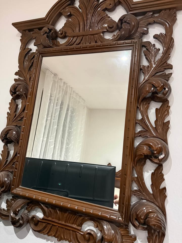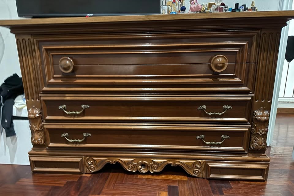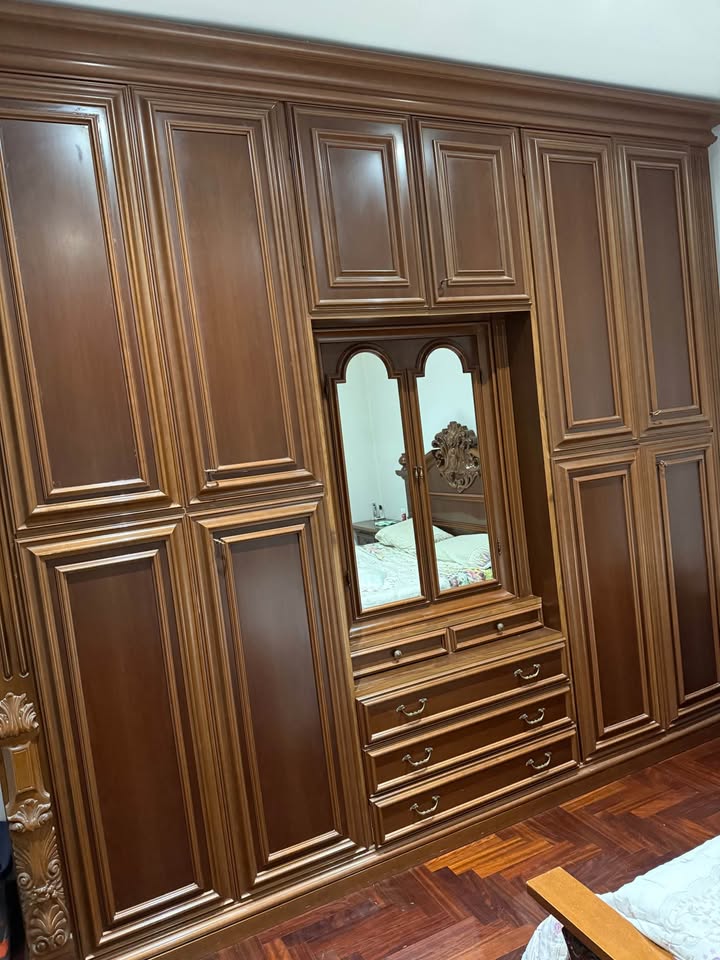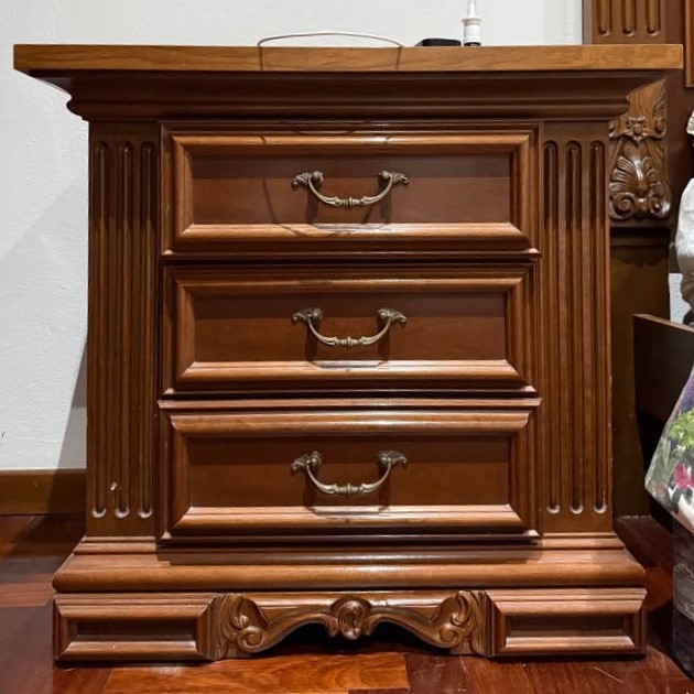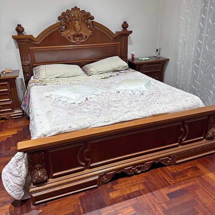 W skład kompletu z drewna wchodzi: łoże, 2 x szafka nocna, szafa, komoda, lustro.
