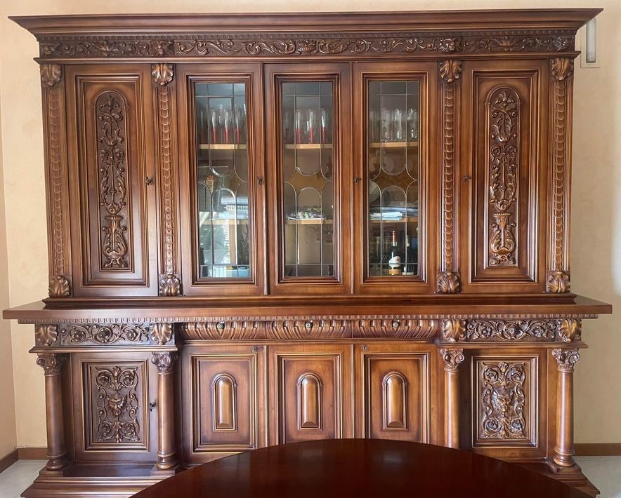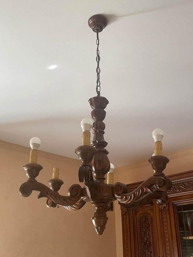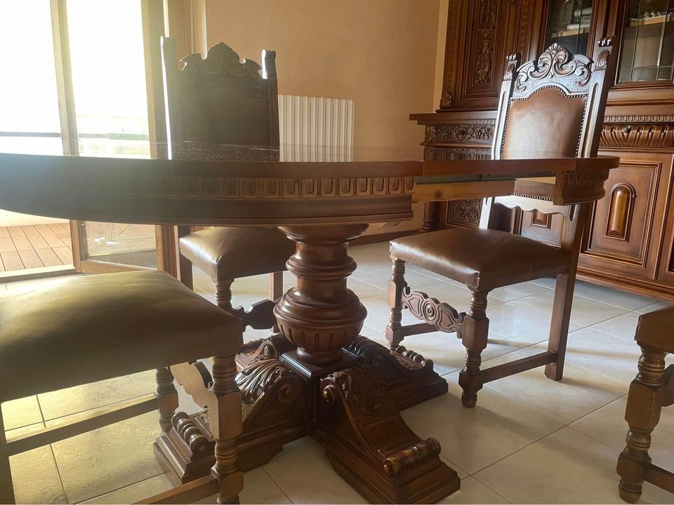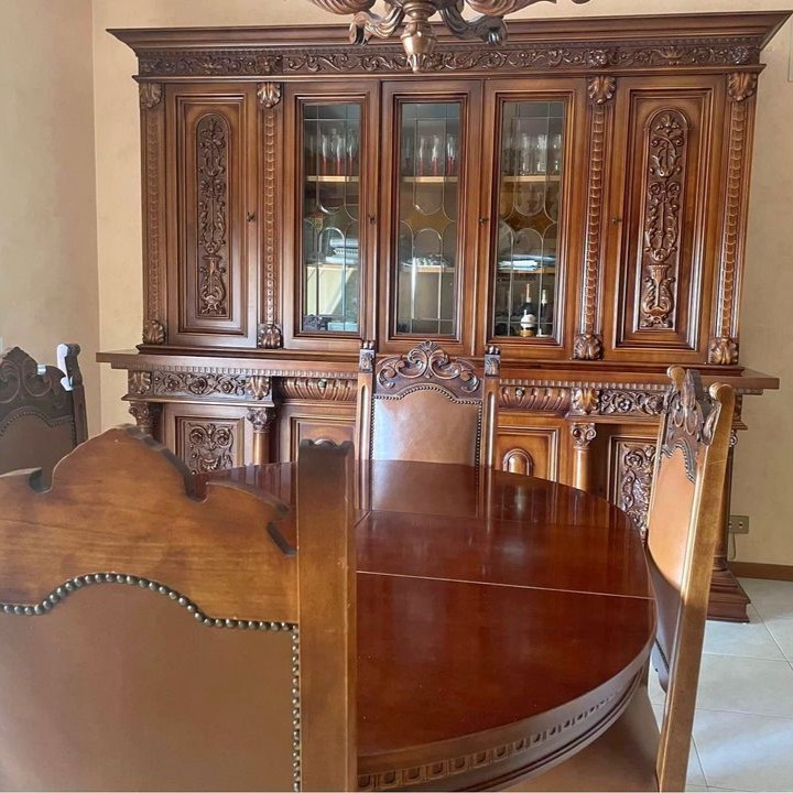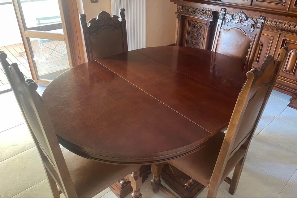 W skład kompletu wchodzi: kredens, rozkładany stół, 6 x krzesło, żyrandol.