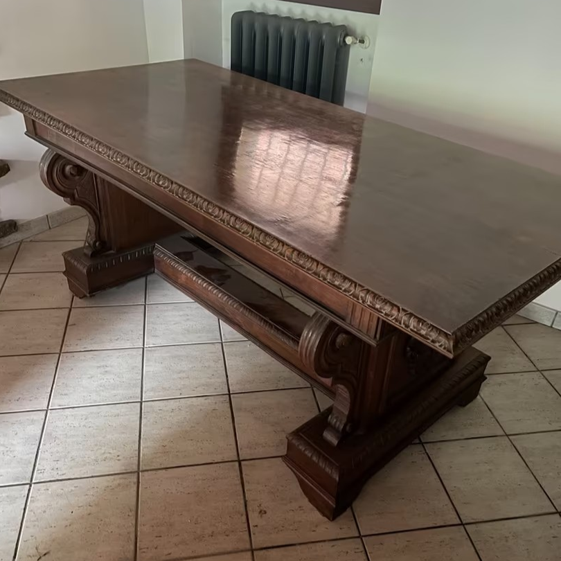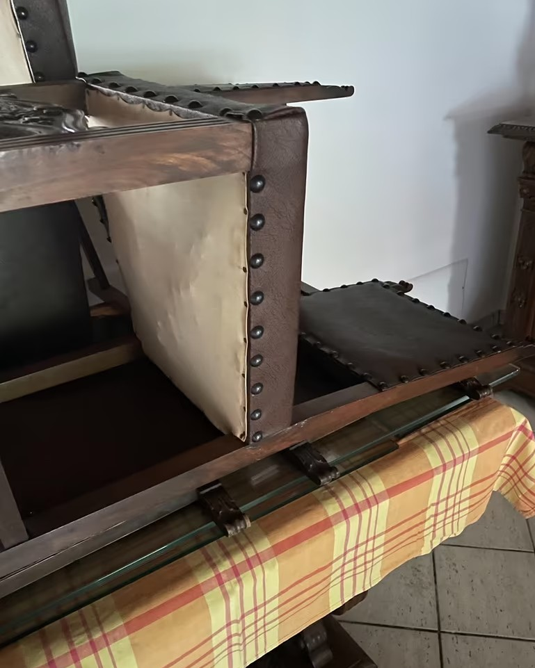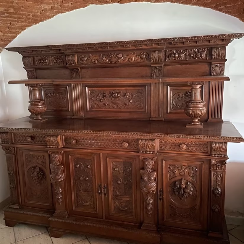 W skład kompletu z drewna orzechowego wchodzi: kredens, stół (200 cm x 100 cm), 6 x krzesło.