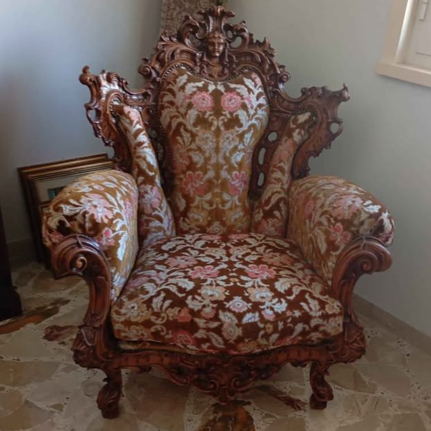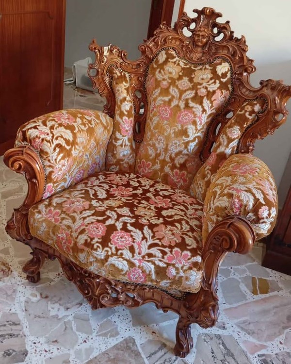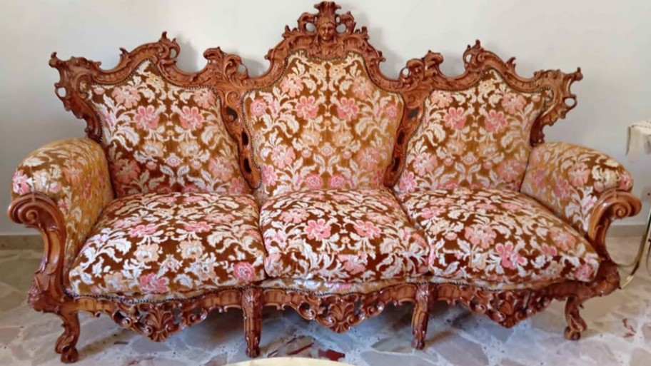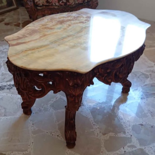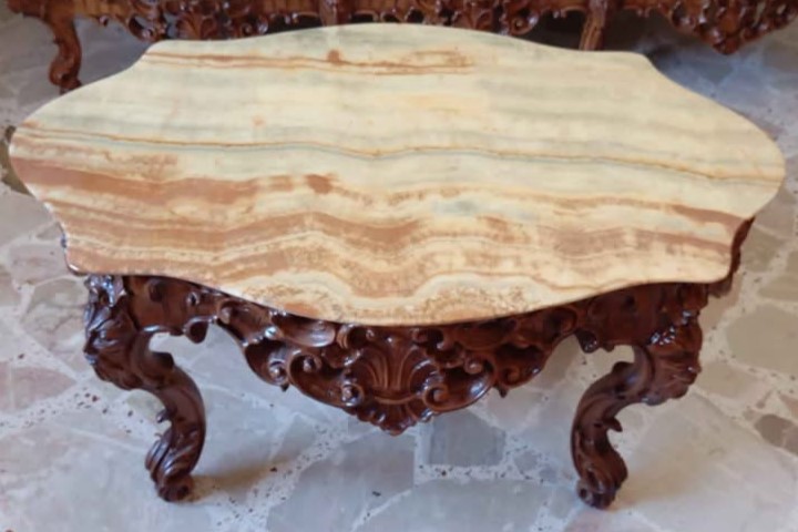 W skład kompletu z drewna wchodzi: sofa 3-osobowa, 2 x fotel, stolik do kawy(blat z marmuru/onyksu).