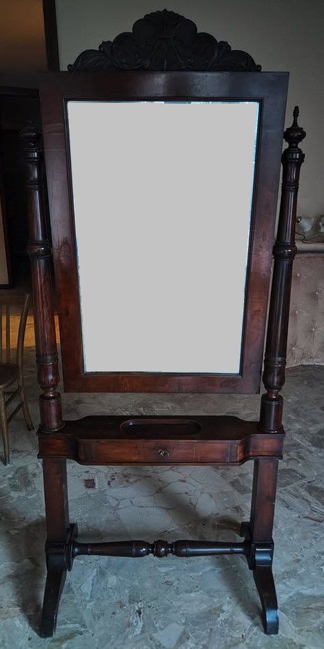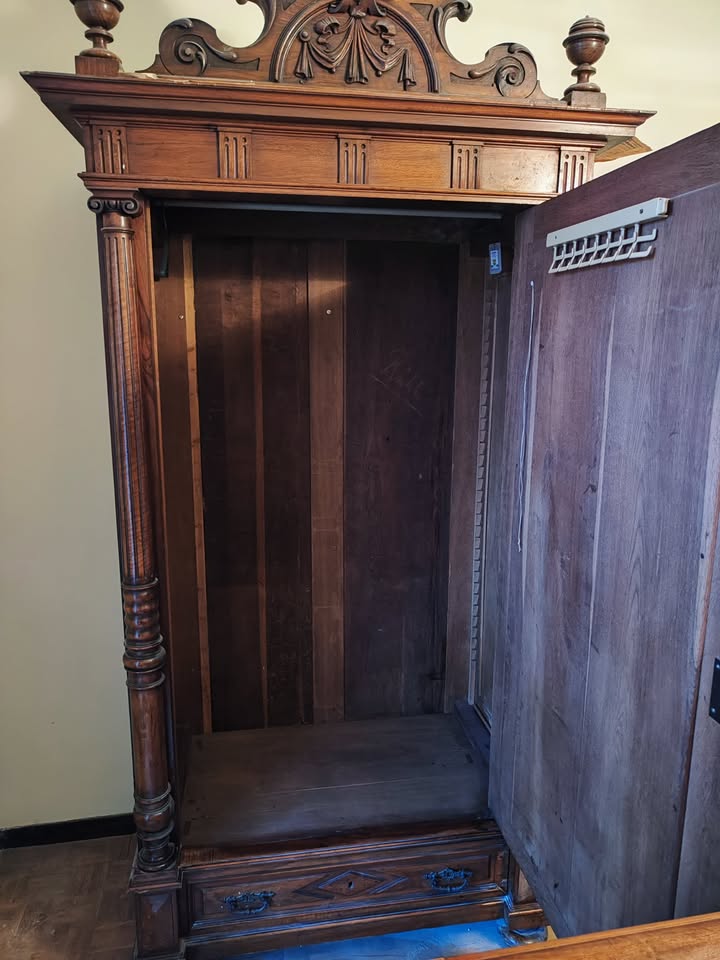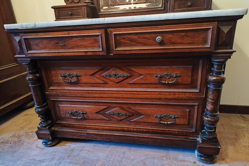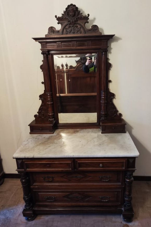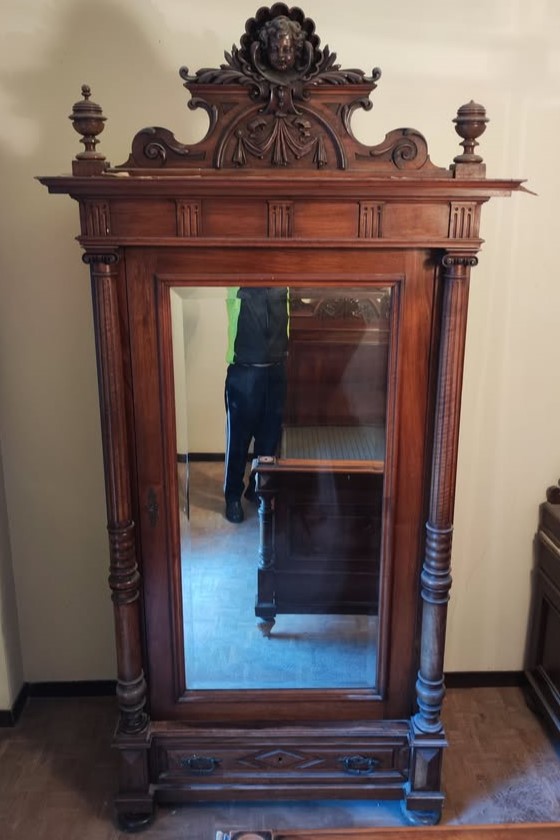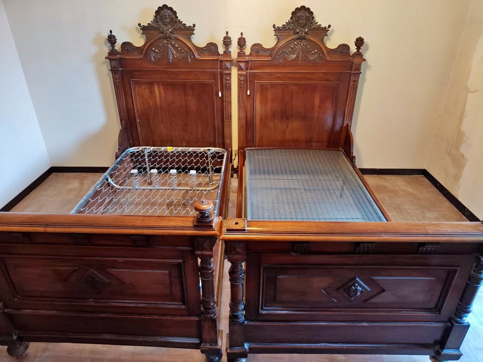 W skład kompletu z drewna orzechowego wchodzi: 2 x łóżko, szafa z lustrem, komoda z lustrem, stolik nocny, lustro stojące.