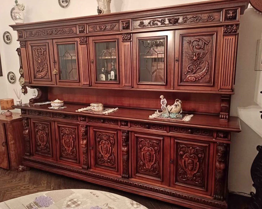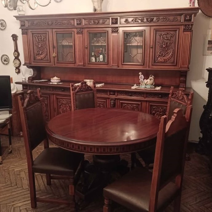 W skład kompletu wchodzi: kredens, stół, 6 x krzesło.