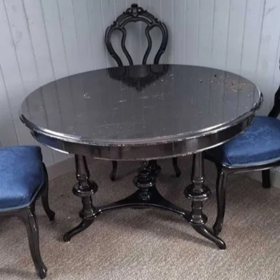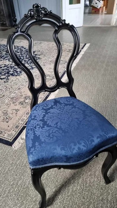 W skład kompletu wchodzi: sofa, 2 x fotel, 4 x krzesło, 2 x stół.
