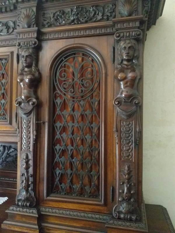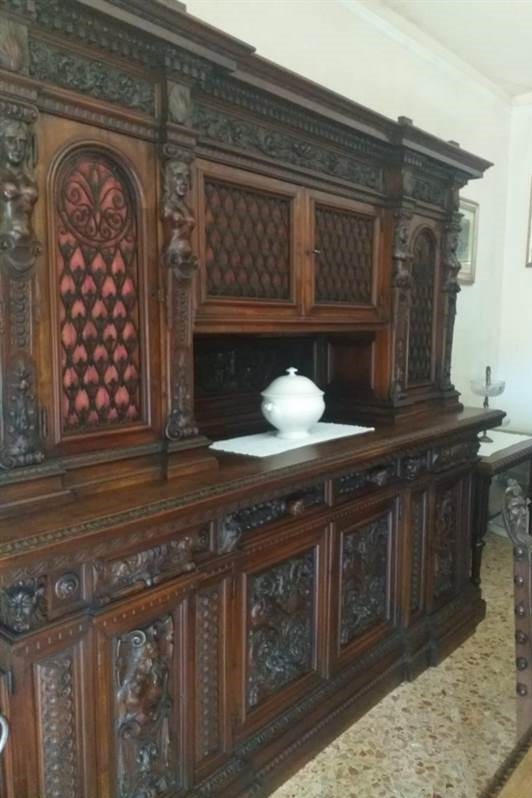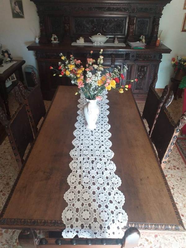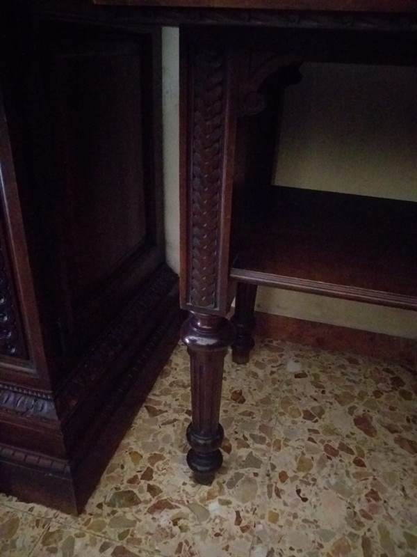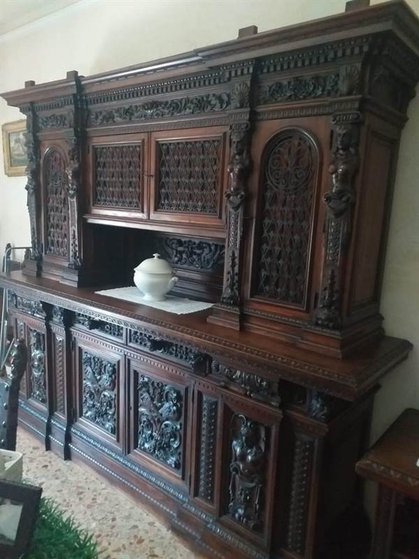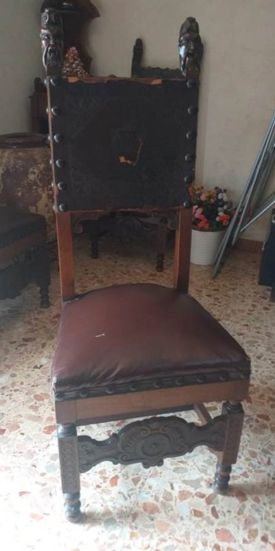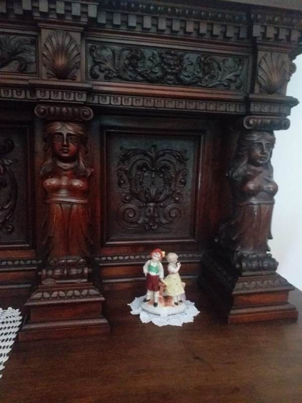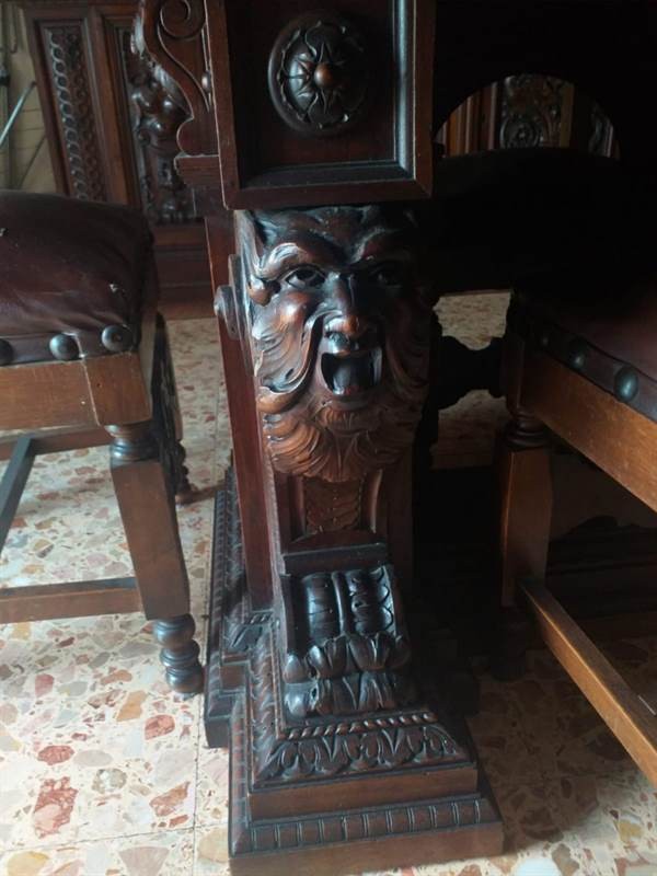 W skład kompletu z drewna orzechowego wchodzi: kredens, pomocnik, stół, stolik, 6 x krzesło.