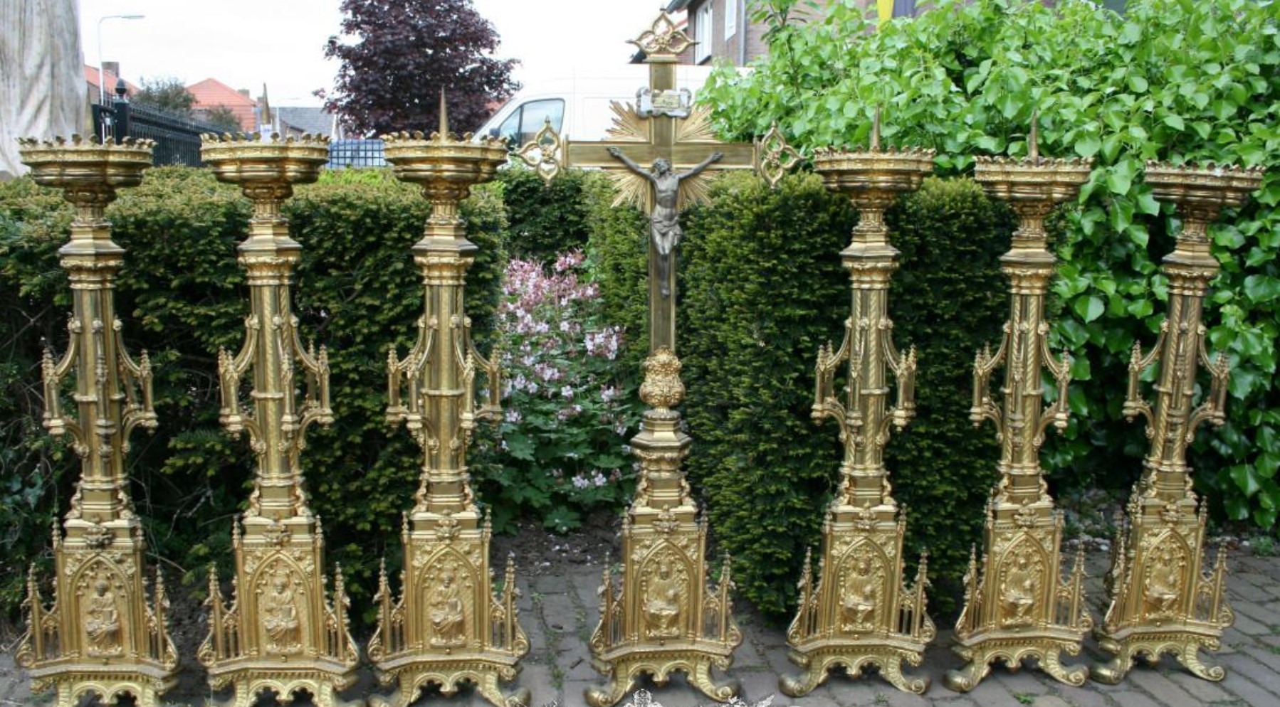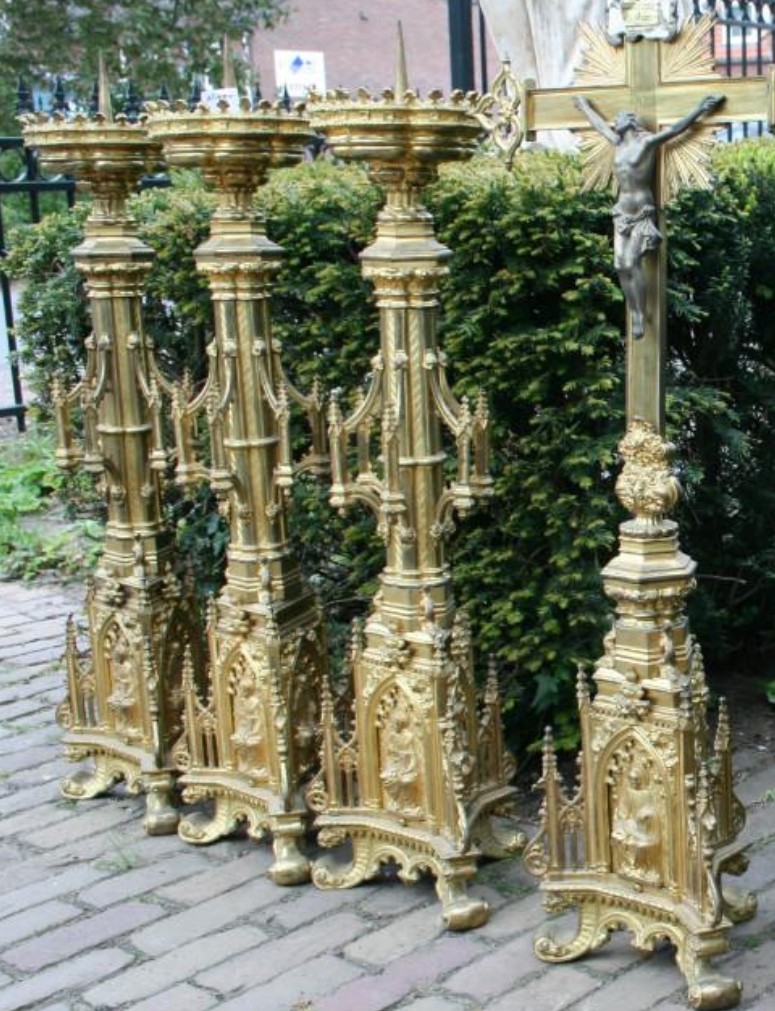 W skład kompletu z pozłacanego brązu wchodzi: krucyfiks, 6 x lichtarz.