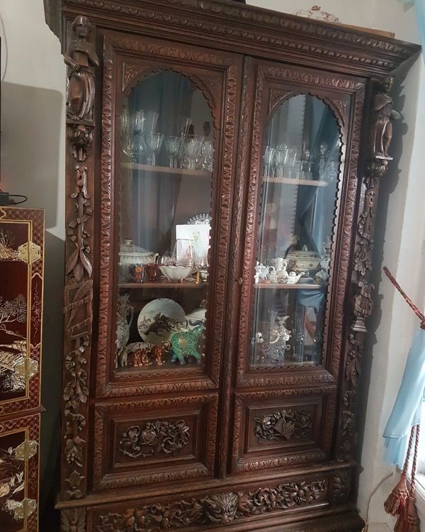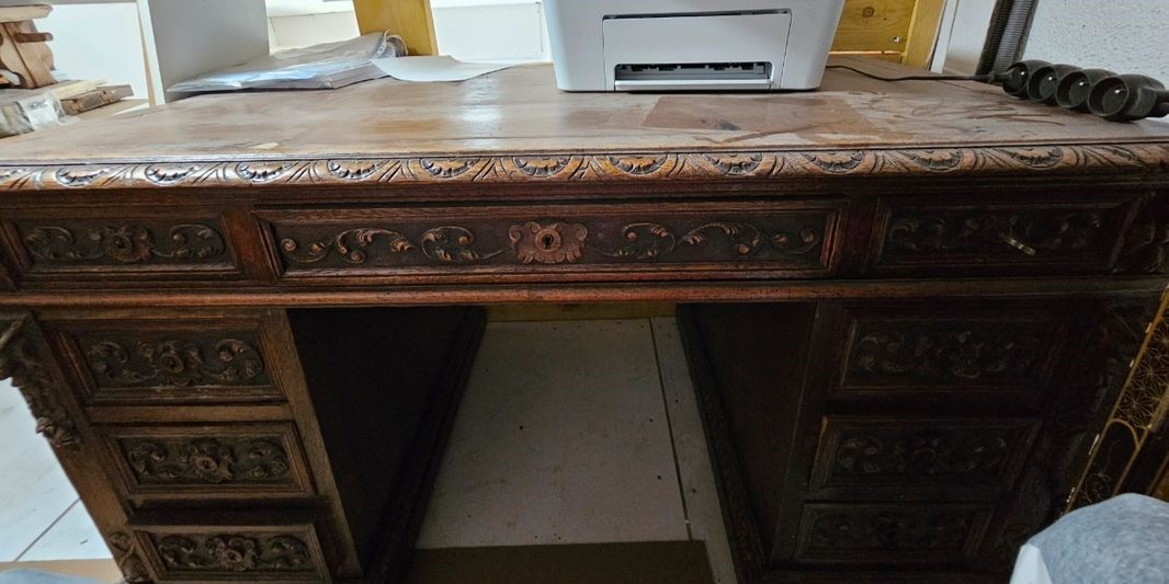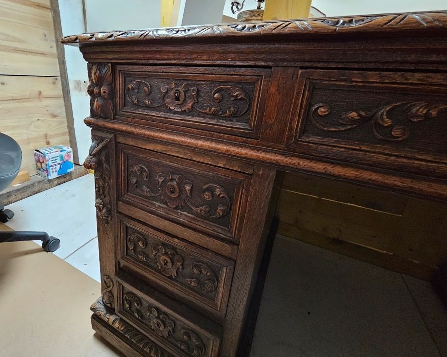 W skład kompletu z drewna wchodzi: biblioteka, biurko, fotel.