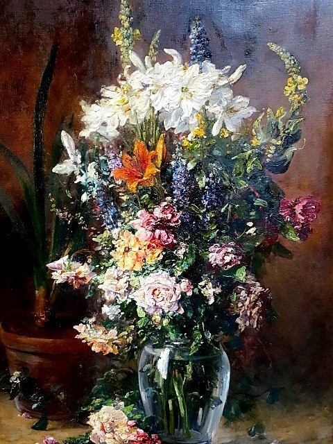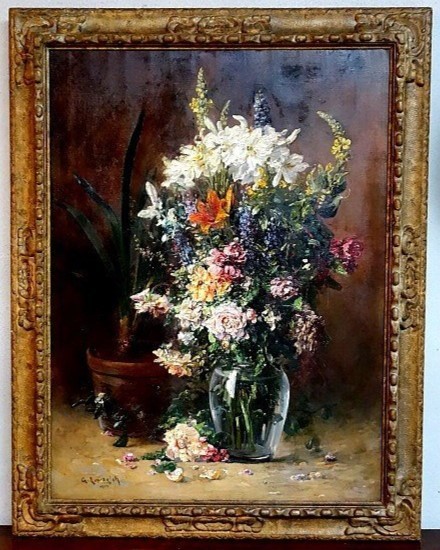 S1929 Bukiet kwiatów, Duży olej na płótnie, XX w.