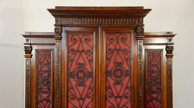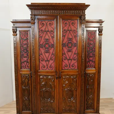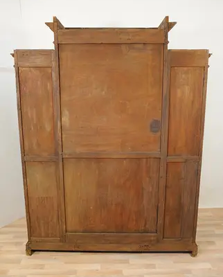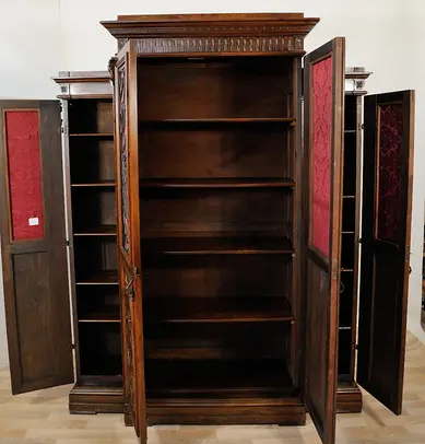 Regał ma trzy oddzielone komory. Każda z nich jest wyposażone w półki i drzwi.