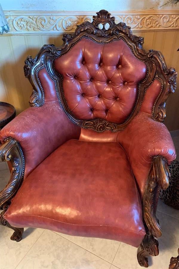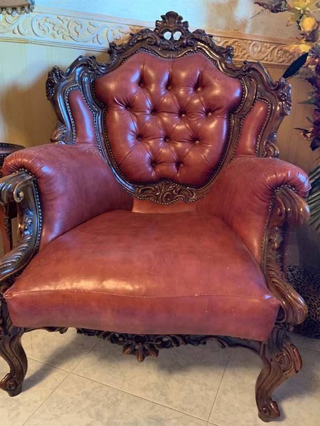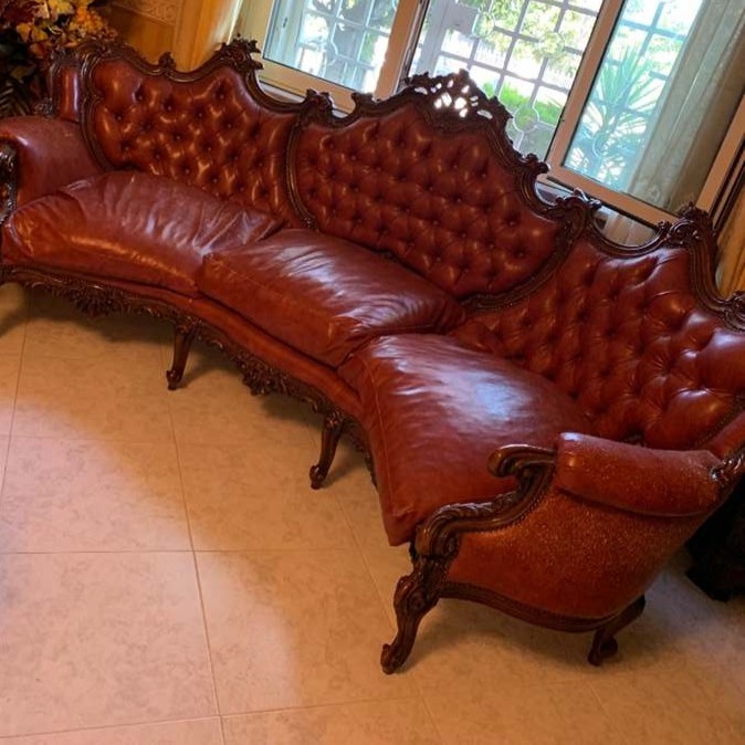 W skład kompletu z drewna mahoniowego wchodzi: duża sofa, 2 x fotel.
