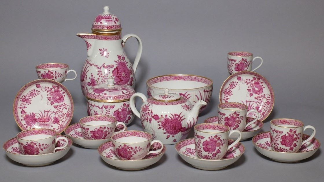 W skład kompletu porcelany miśnieńskiej wchodzi: dzbanek, imbryk, cukiernica, miseczka, 4 x filiżanka do herbaty, 4 x filiżanka do kawy, 8 x spodek.