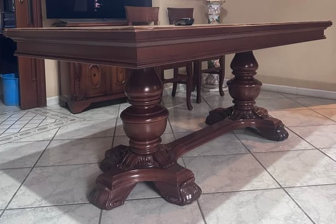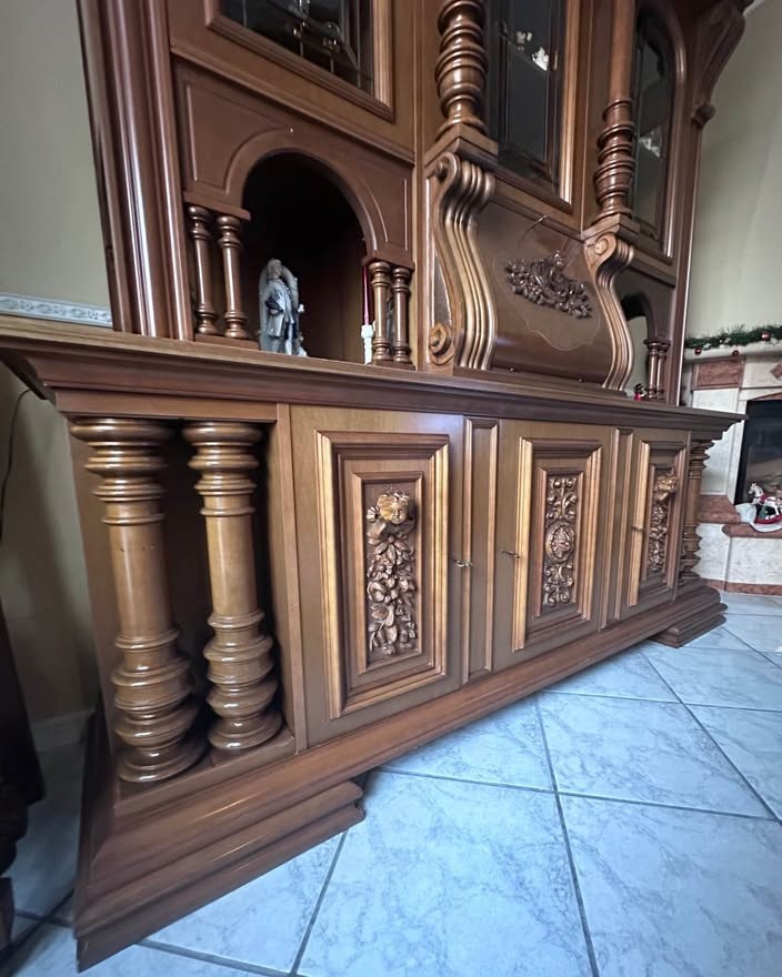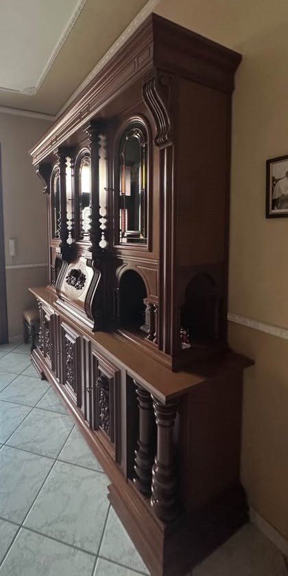 W skład kompletu z drewna wchodzi: kredens, stół, 6 x krzesło.