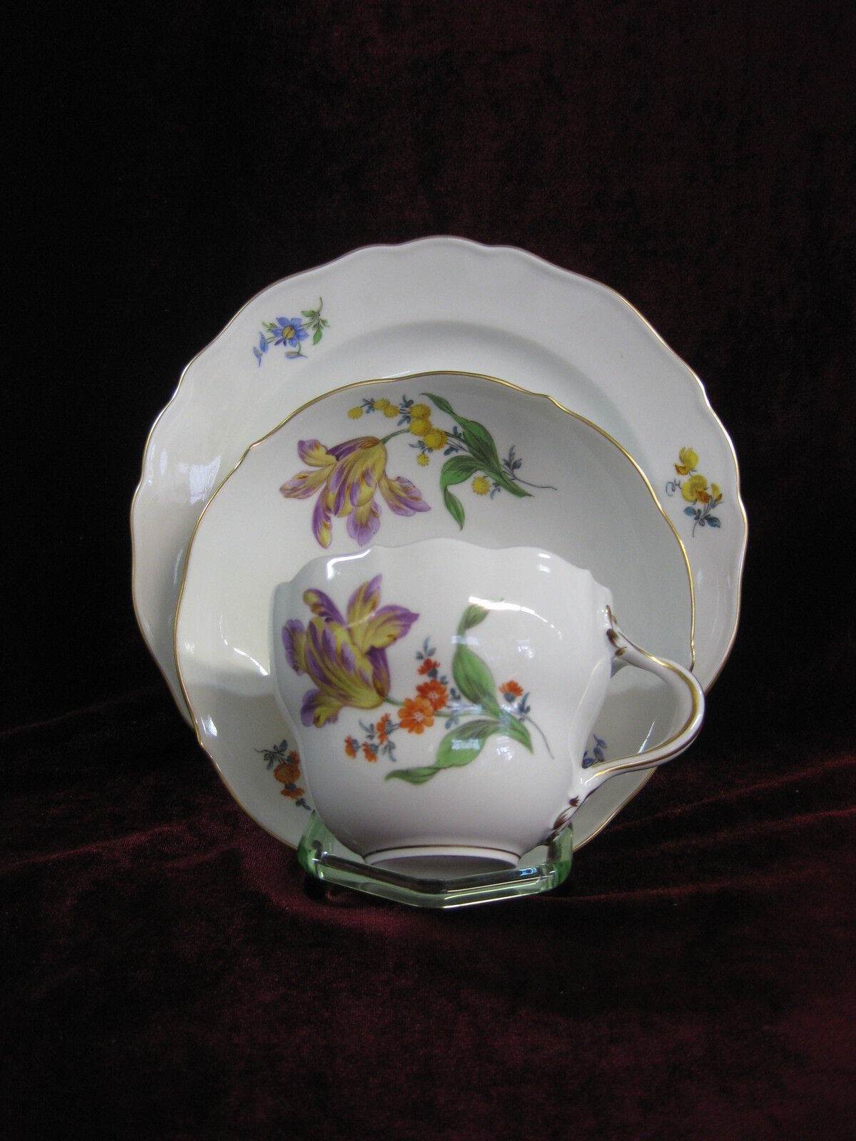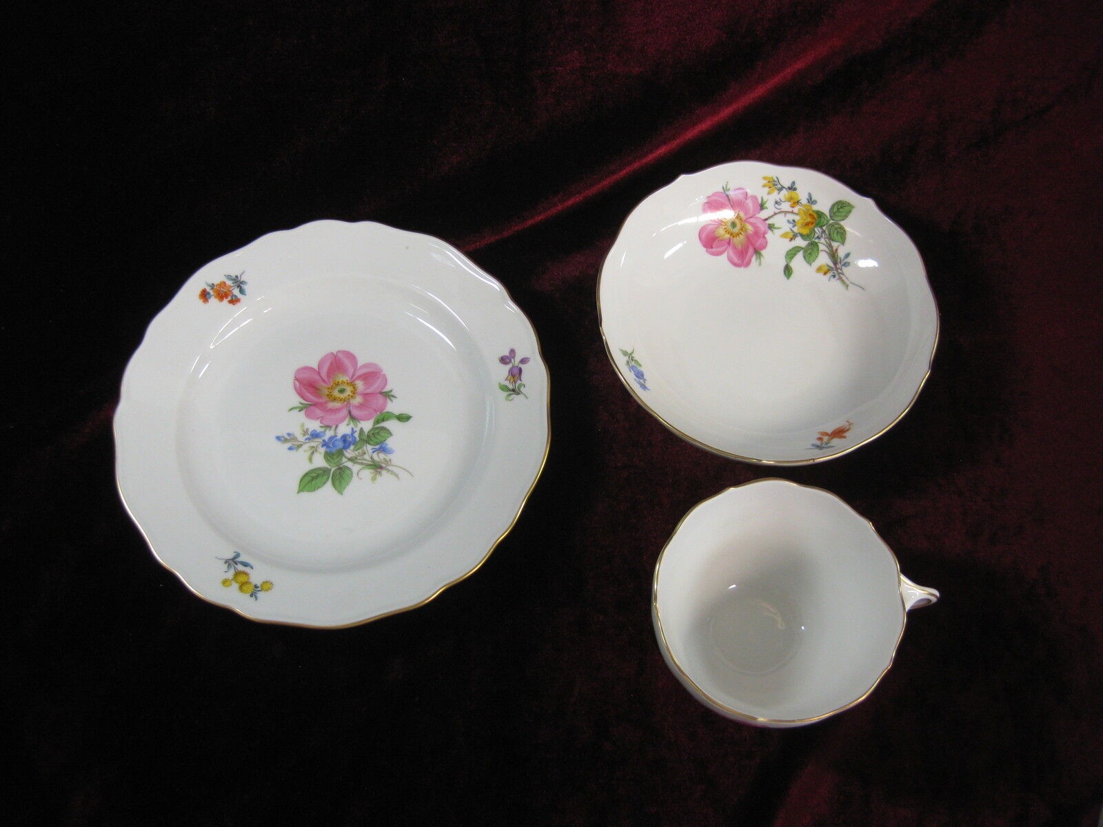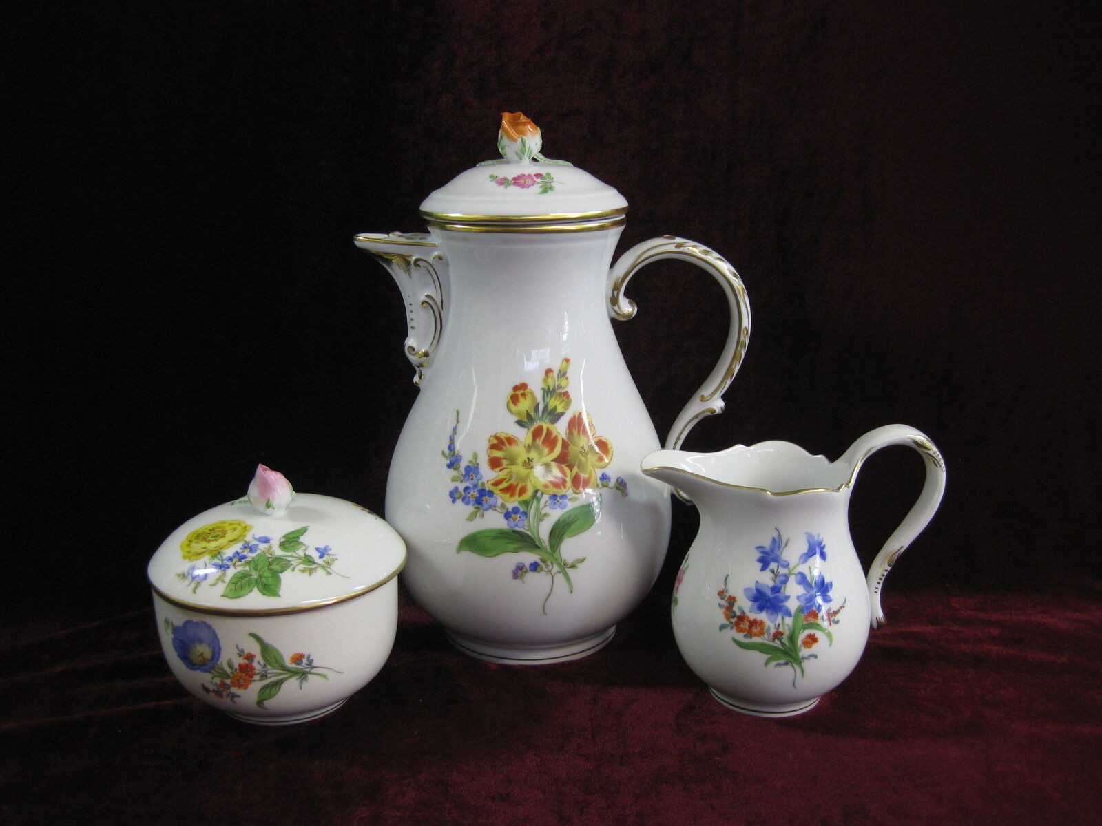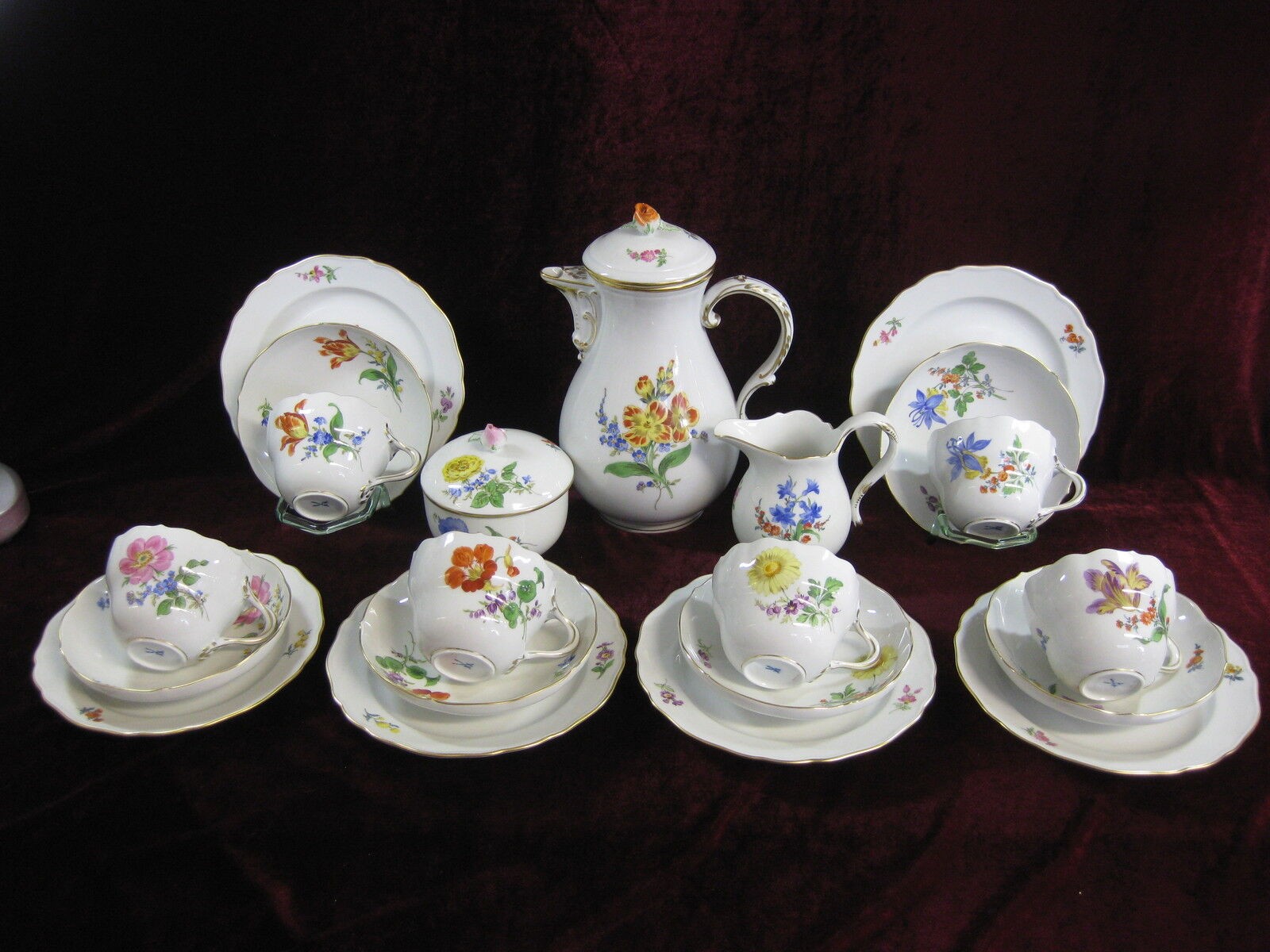 W skład kompletu porcelany miśnieńskiej wchodzi: dzbanek do kawy, mlecznik, cukiernica, 6 x filiżanka, 6 x spodek, 6 x talerzyk deserowy.