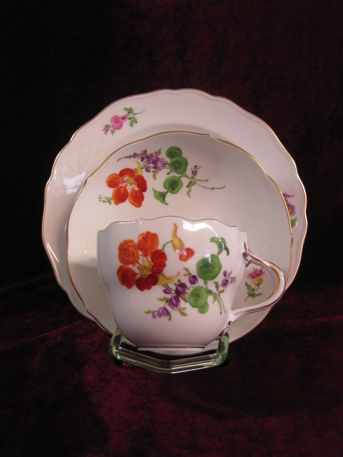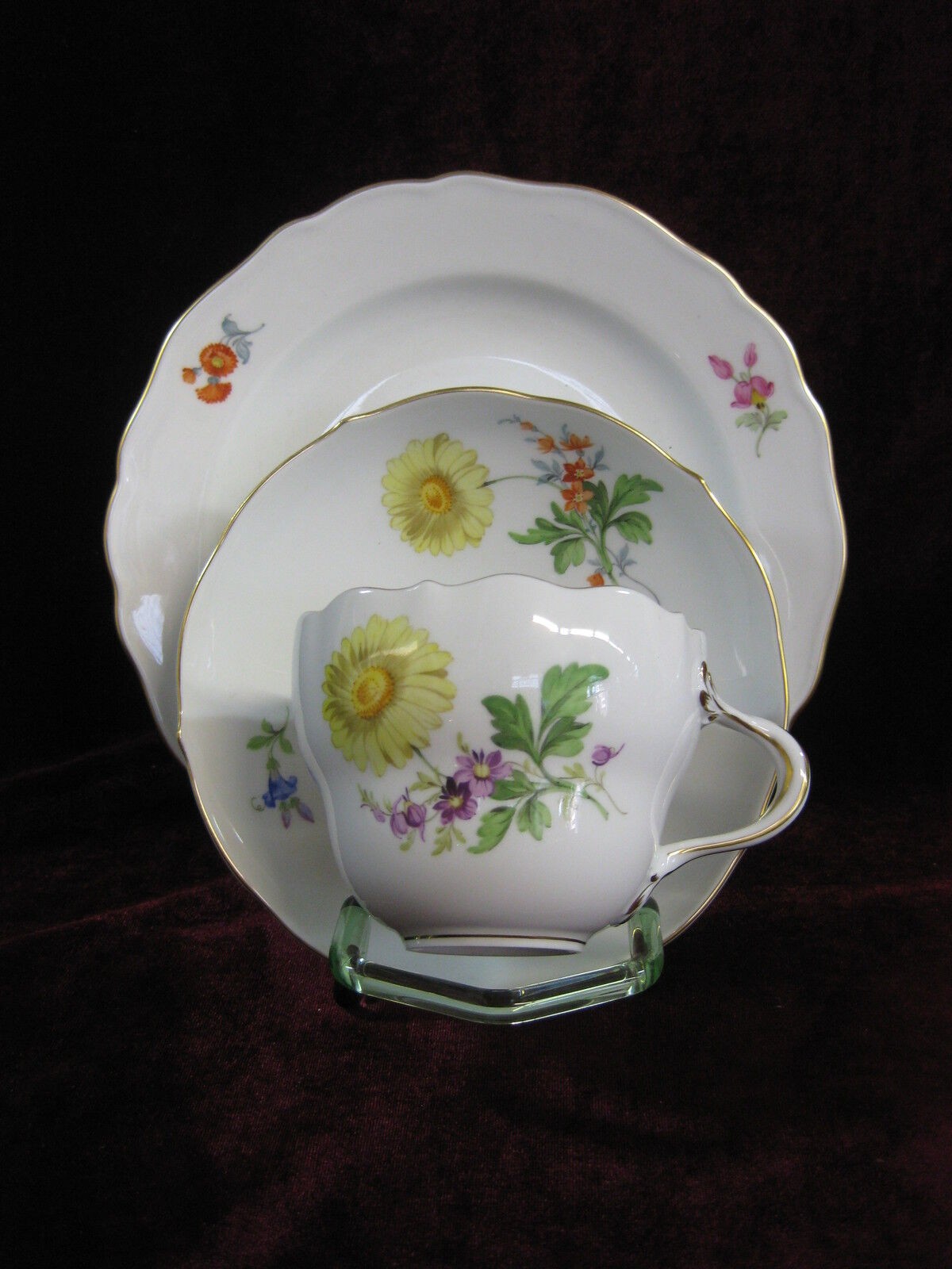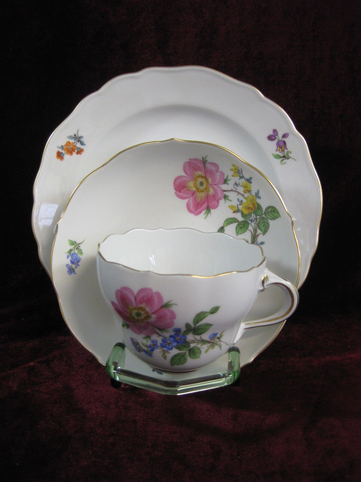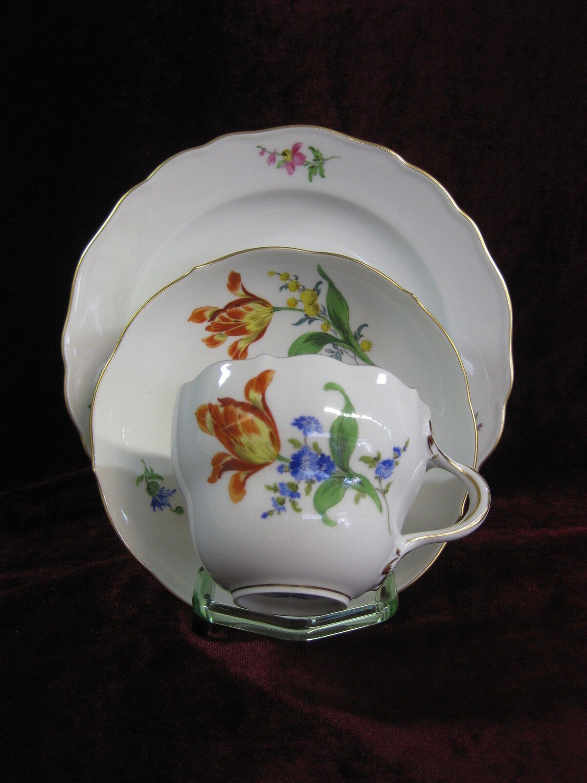 W skład kompletu porcelany miśnieńskiej wchodzi: dzbanek do kawy, mlecznik, cukiernica, 6 x filiżanka, 6 x spodek, 6 x talerzyk deserowy.