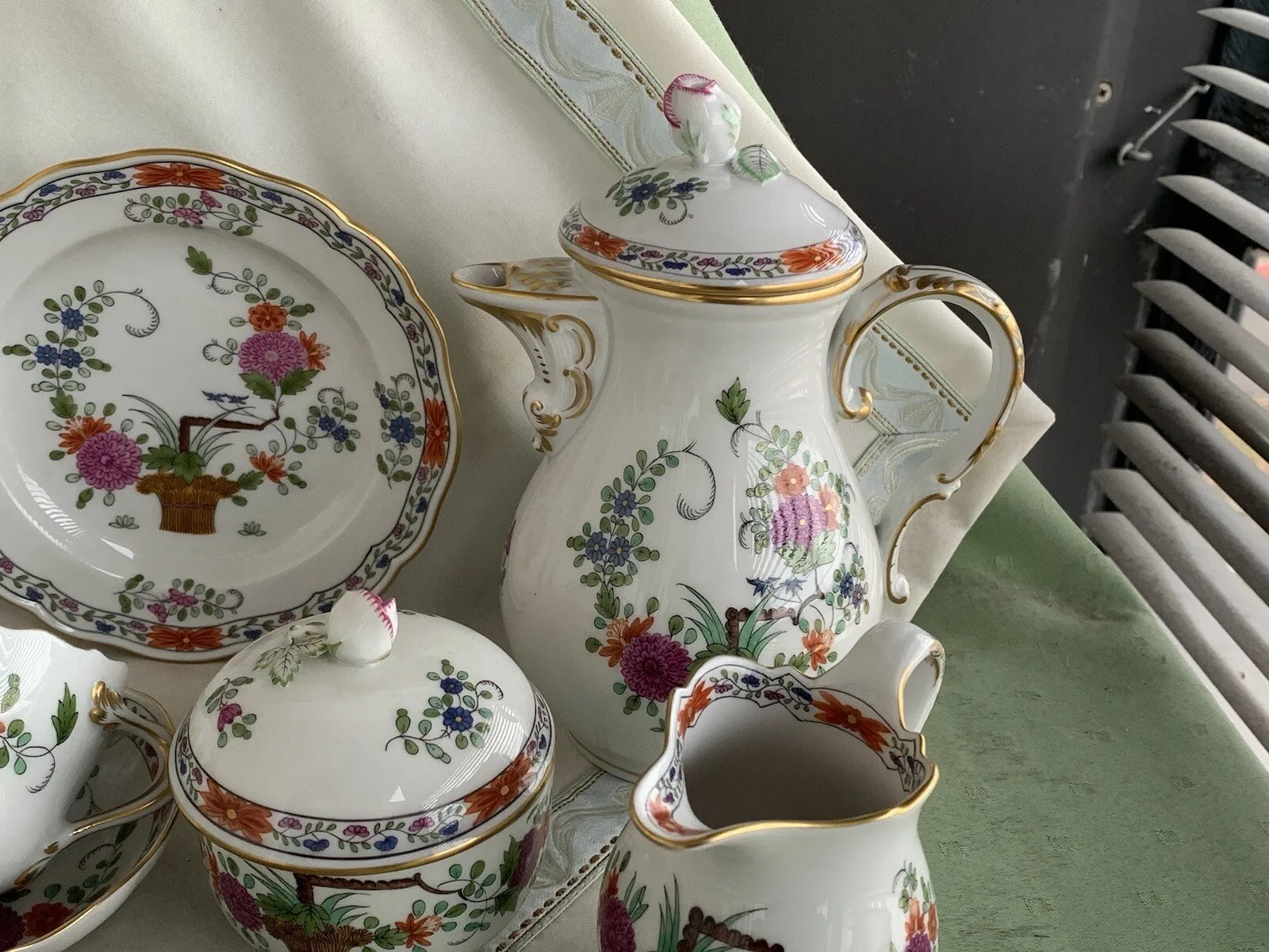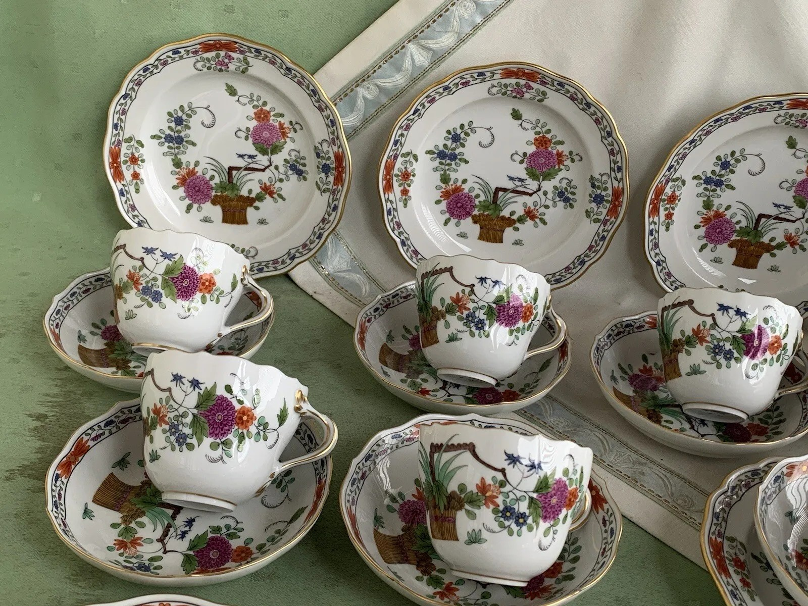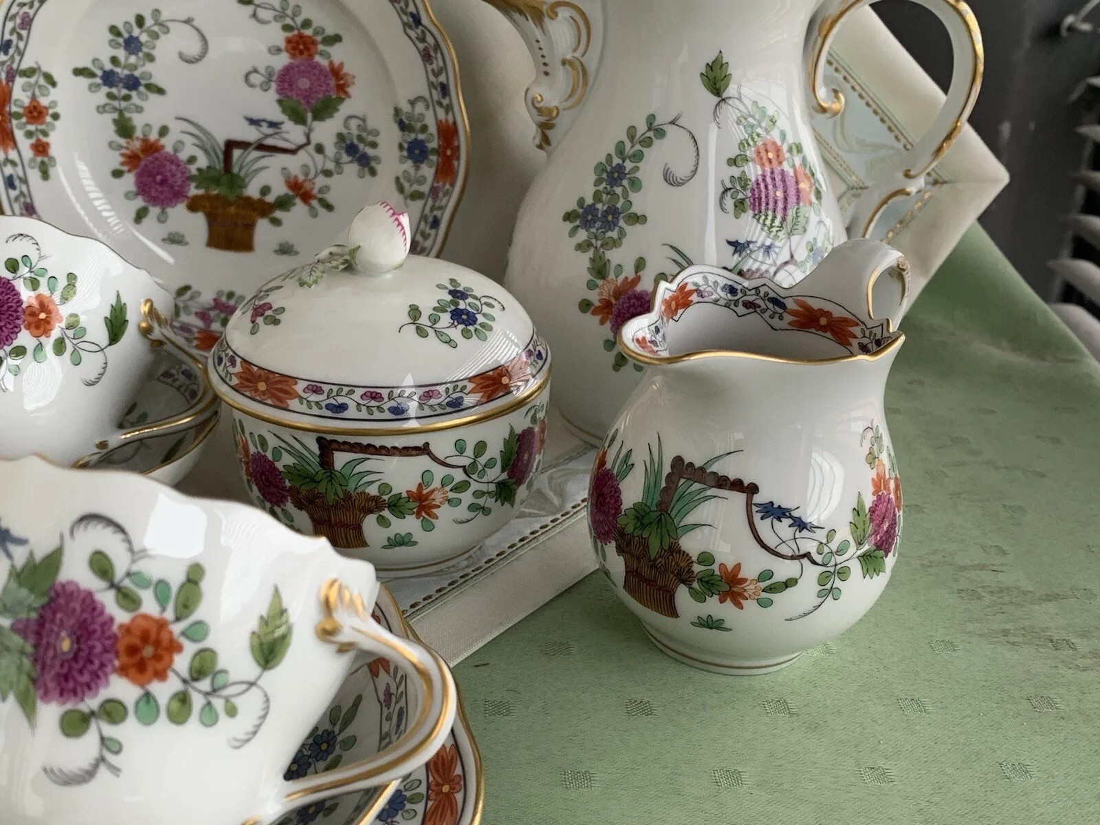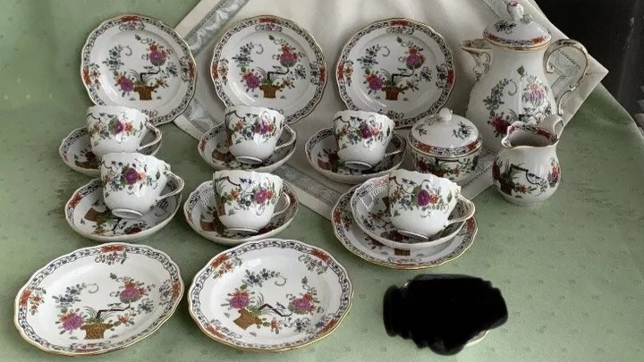 W skład kompletu porcelany miśnieńskiej wchodzi: dzbanek, mlecznik, cukiernica, 6 x filiżanka, 6 x spodek, 6 x talerzyk deserowy.