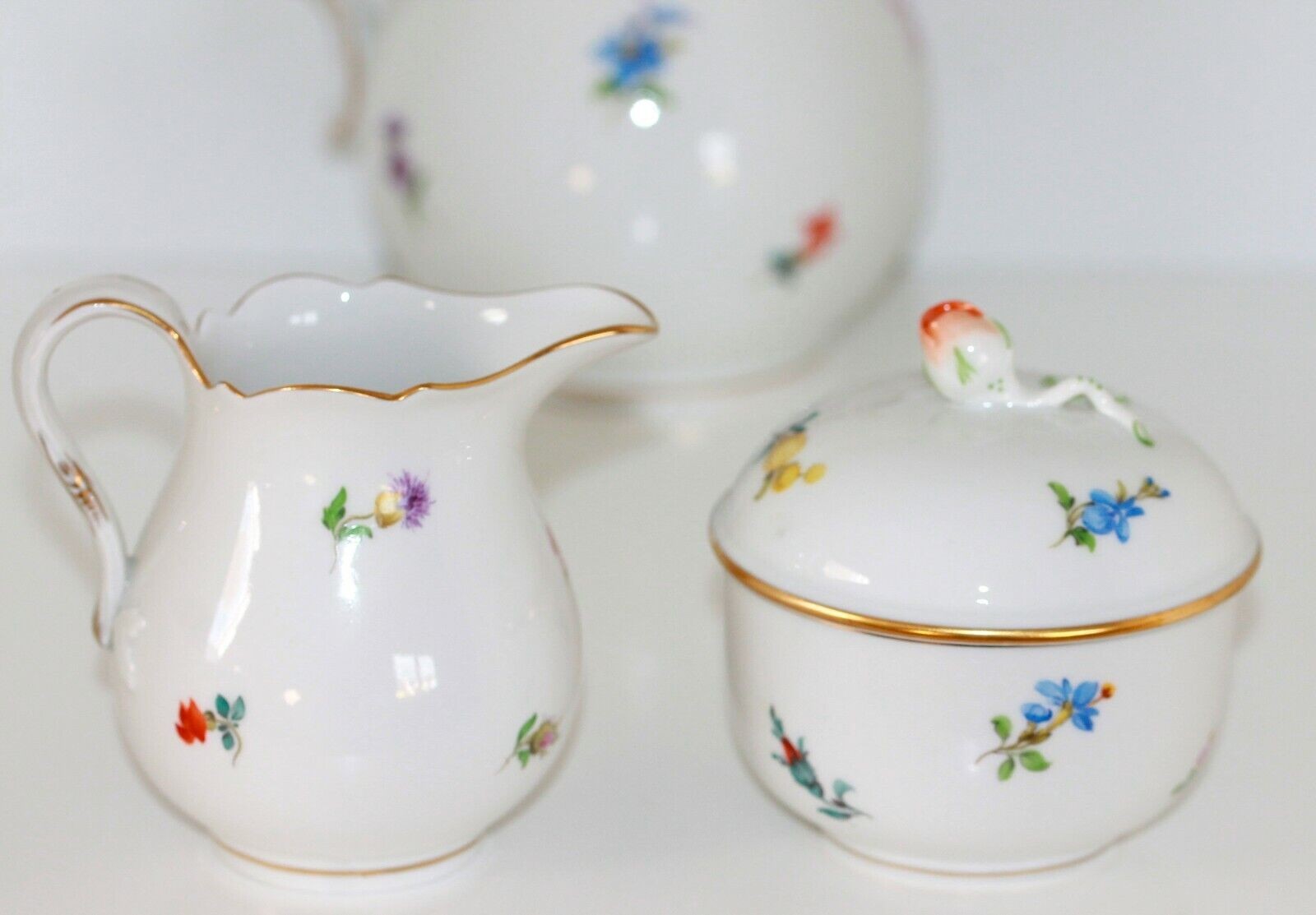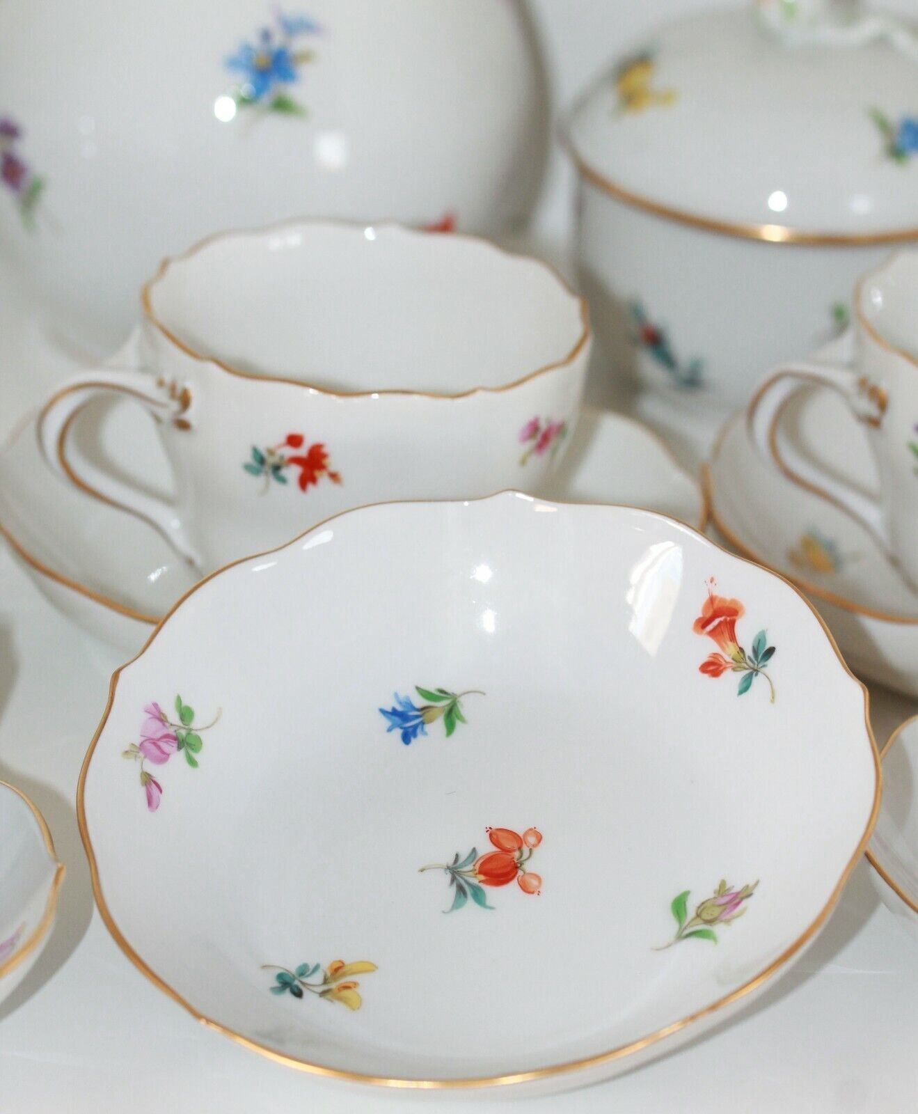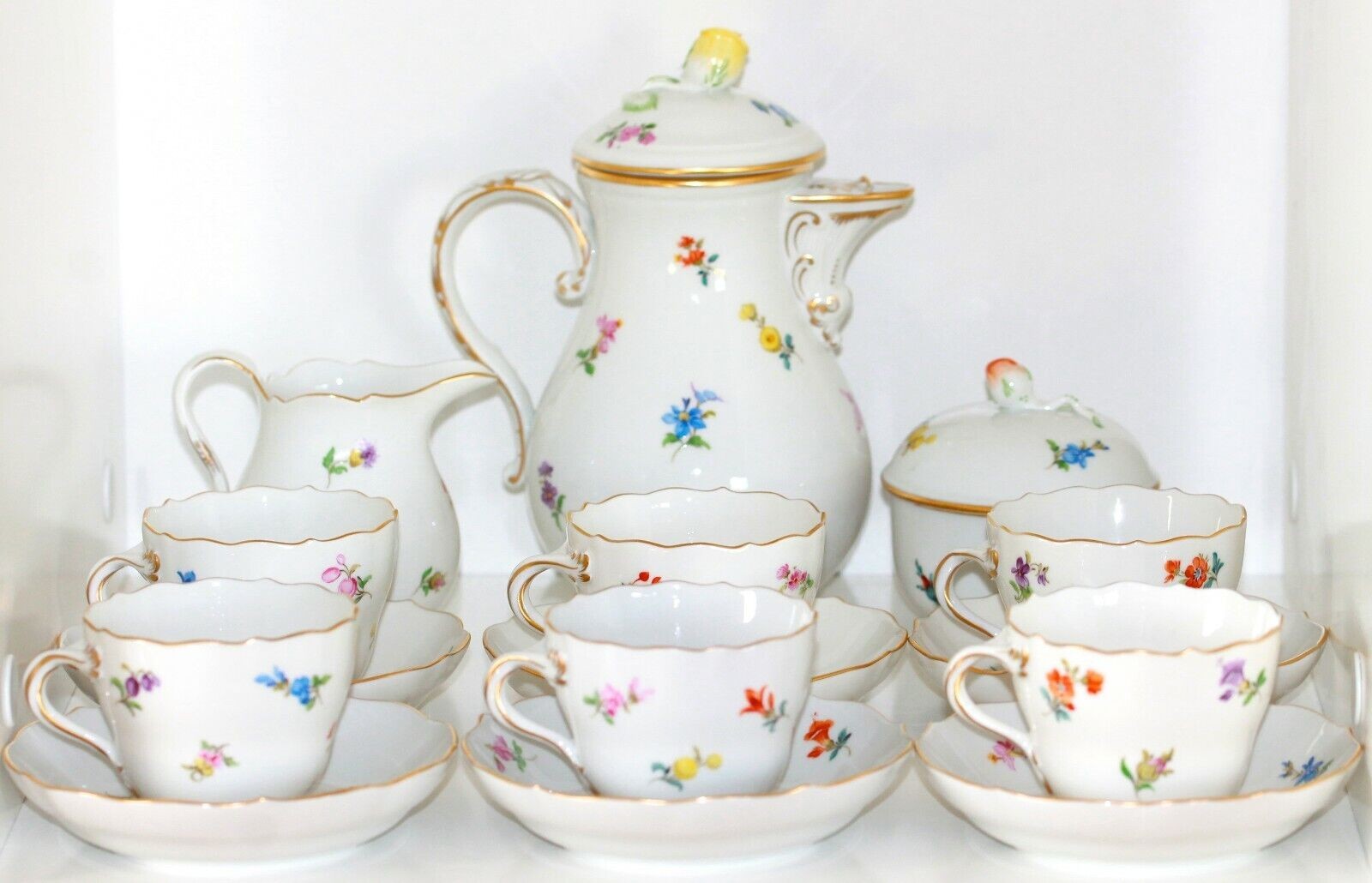 W skład kompletu porcelany miśnieńskiej wchodzi: dzbanek, mlecznik, cukiernica, 6 x filiżanka, 6 x spodek.