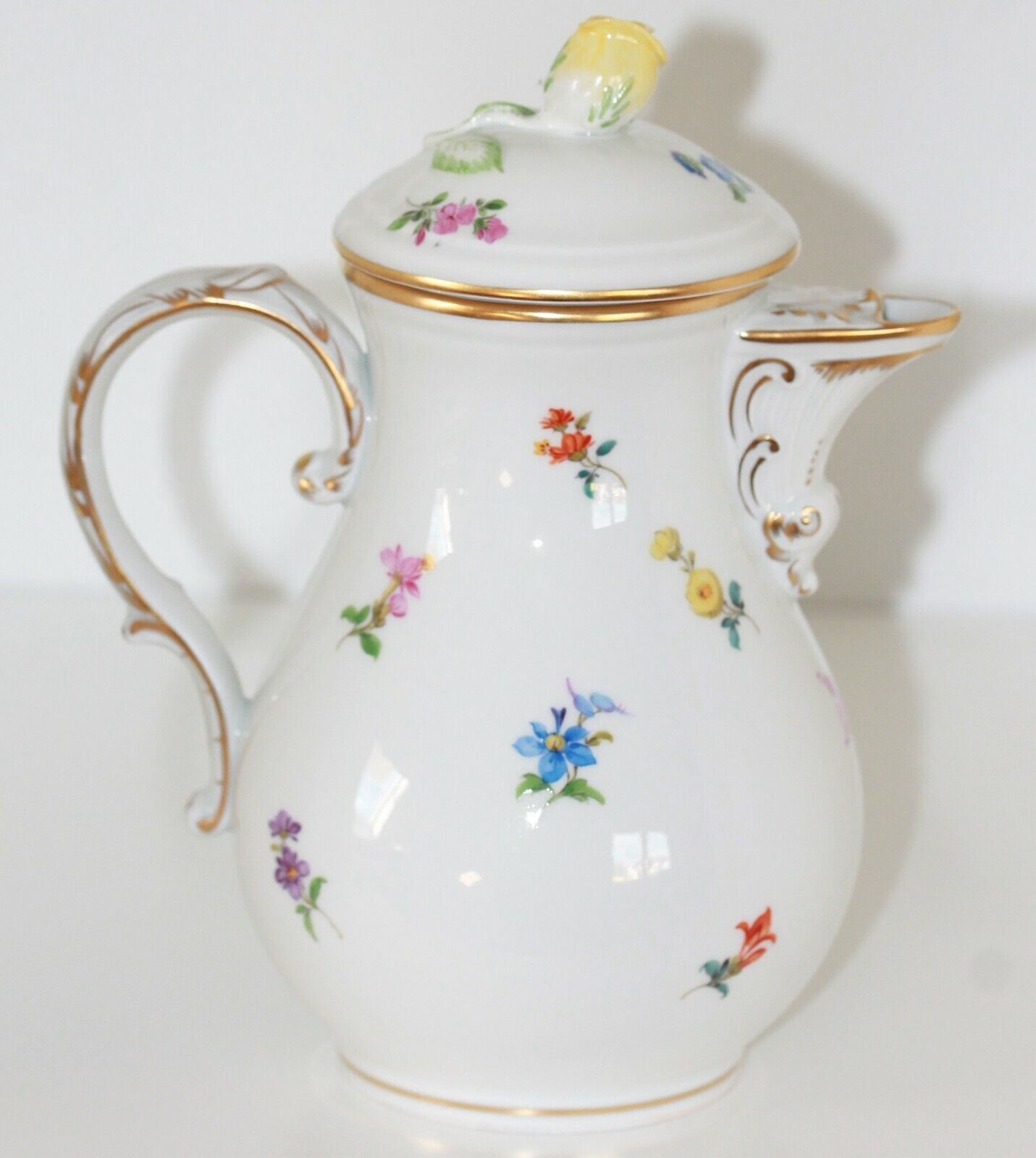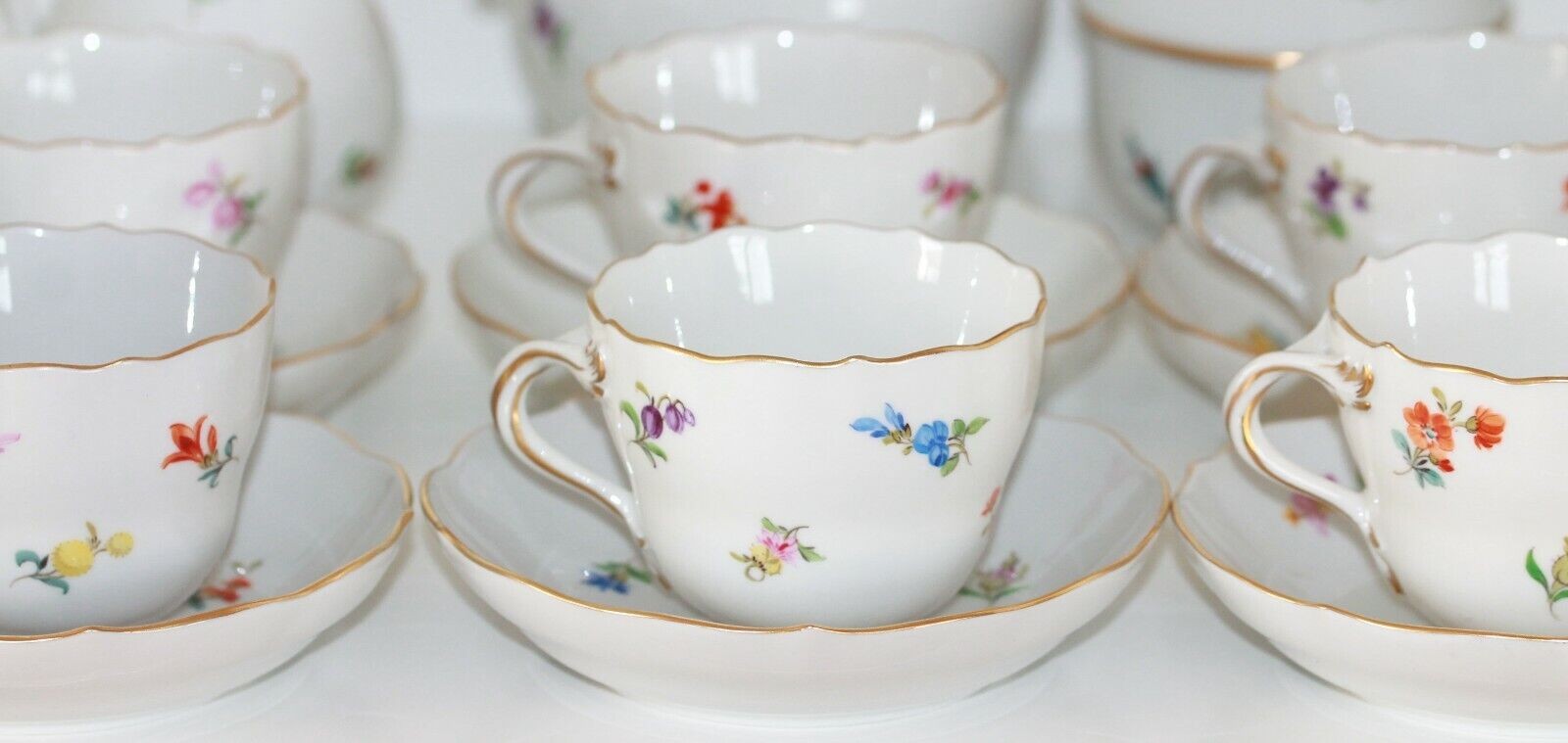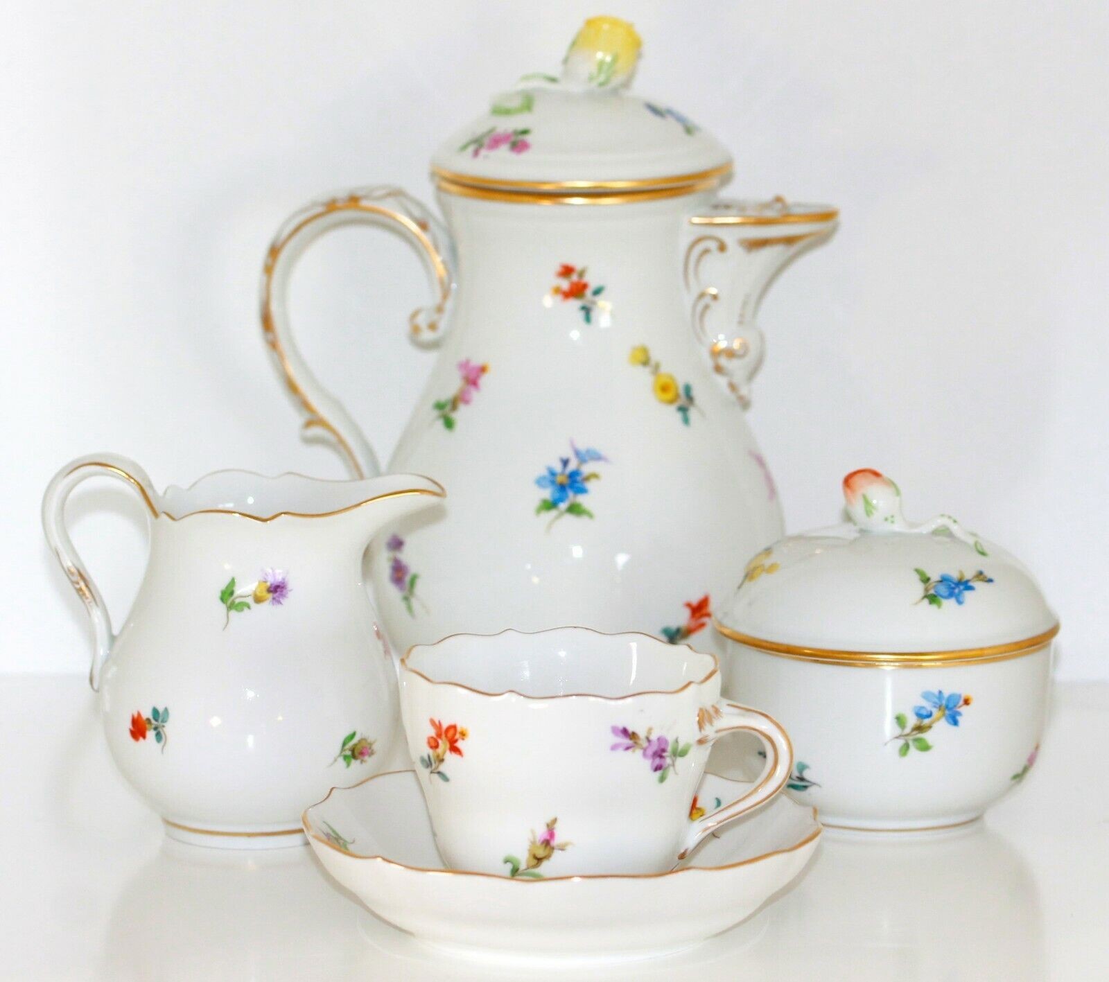 W skład kompletu porcelany miśnieńskiej wchodzi: dzbanek, mlecznik, cukiernica, 6 x filiżanka, 6 x spodek.