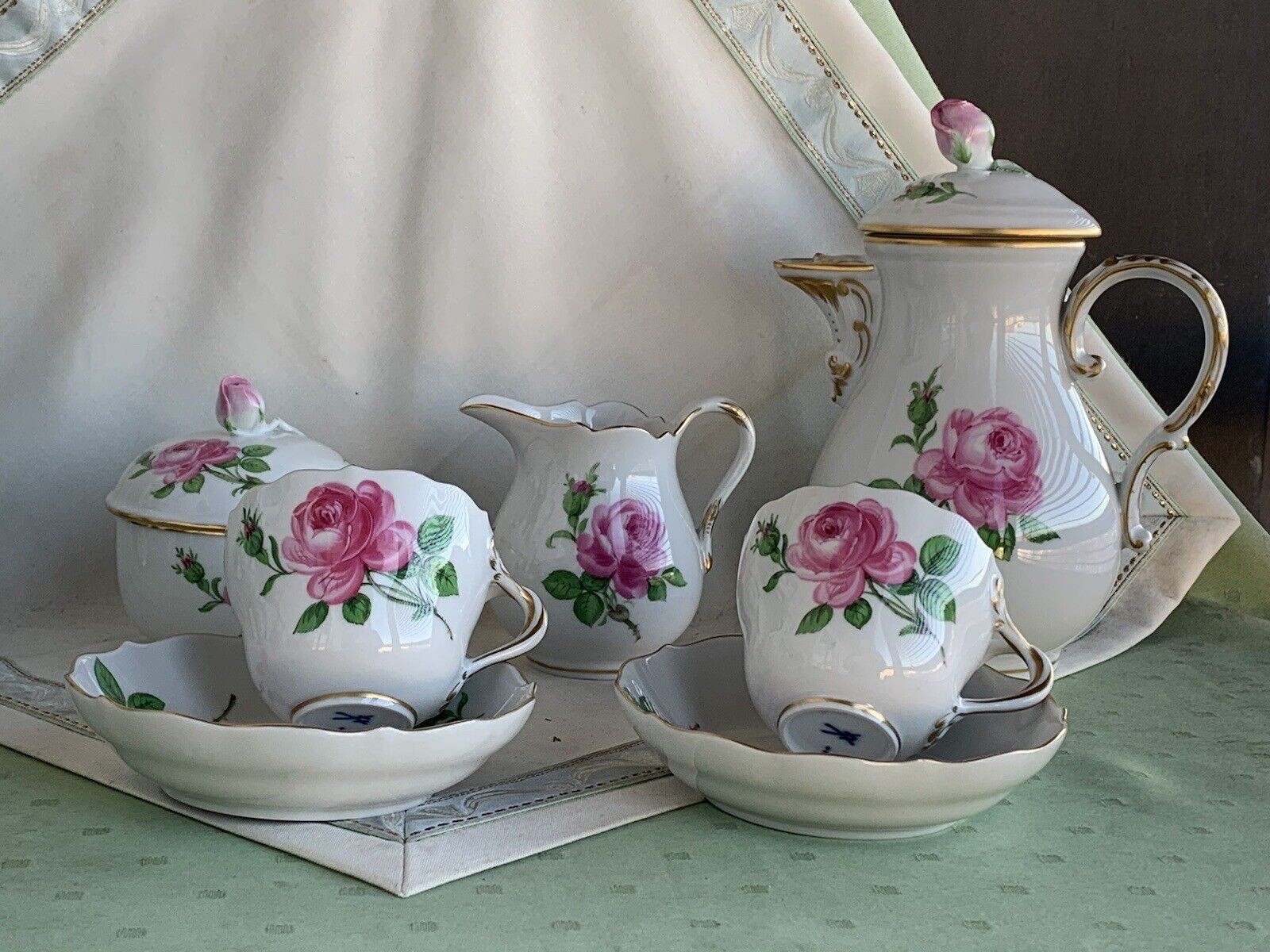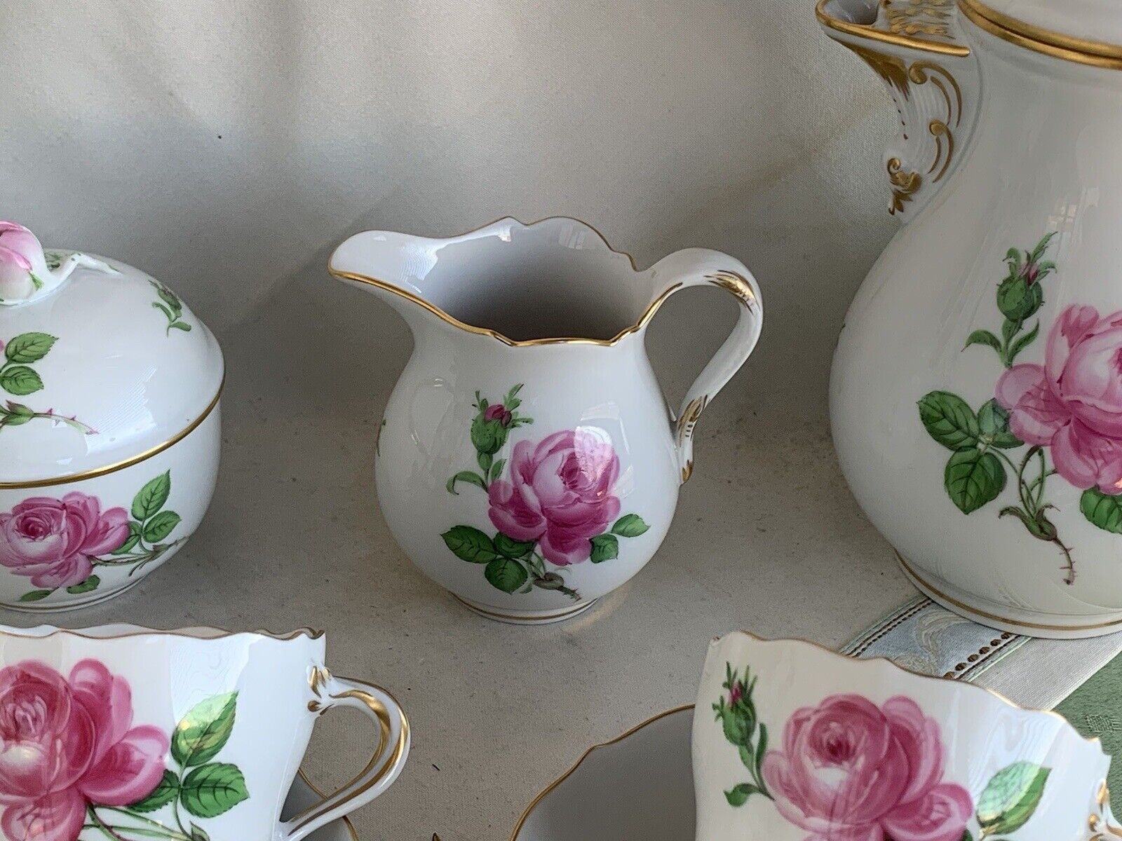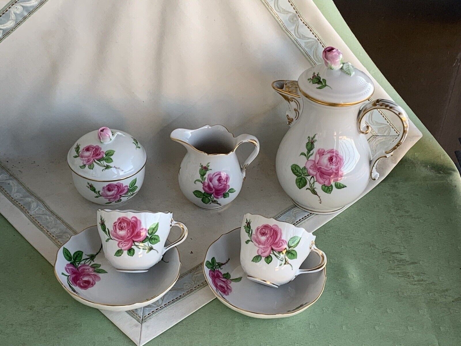 W skład kompletu porcelany miśnieńskiej wchodzi: dzbanek, mlecznik, cukiernica, 2 x filiżanka, 2 x spodek.
