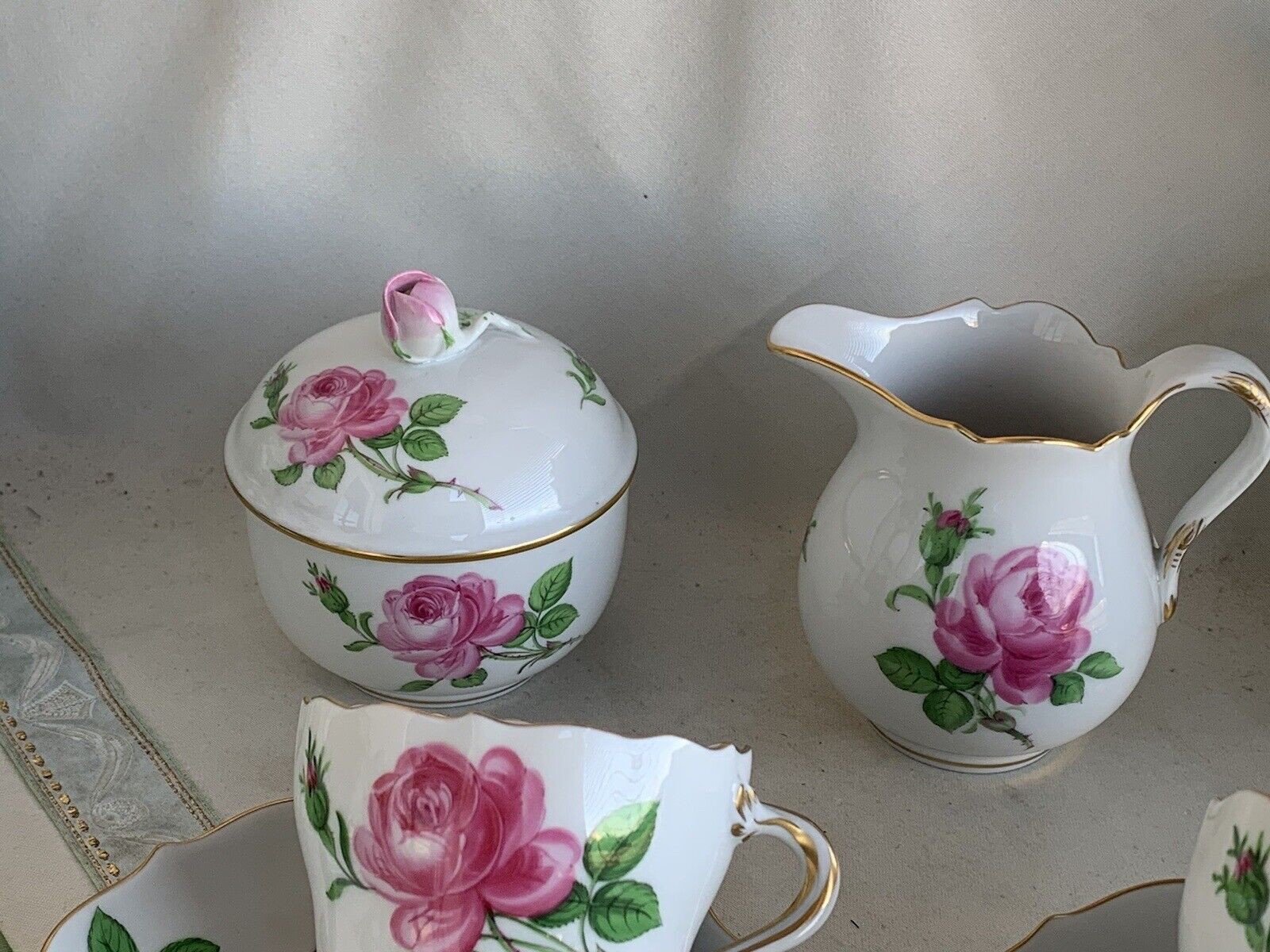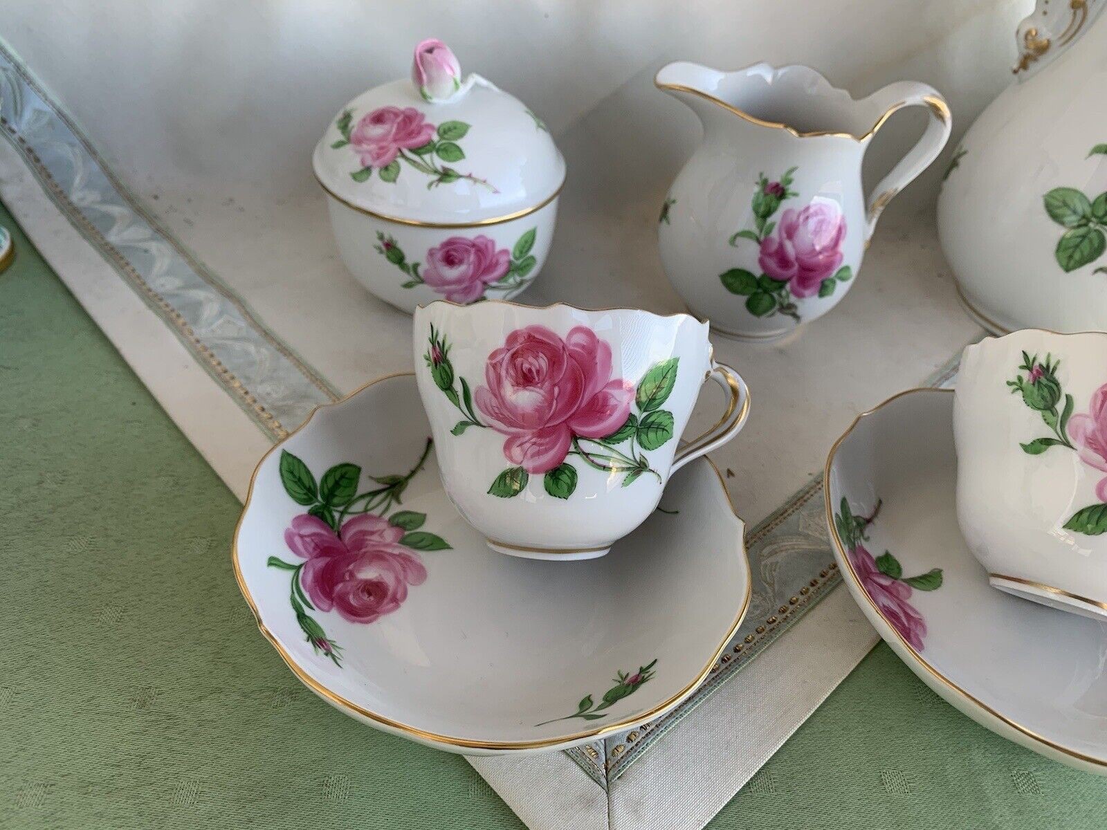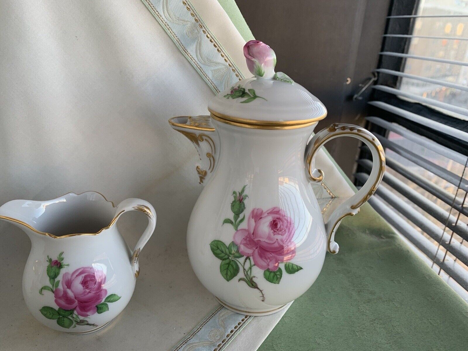 W skład kompletu porcelany miśnieńskiej wchodzi: dzbanek, mlecznik, cukiernica, 2 x filiżanka, 2 x spodek.