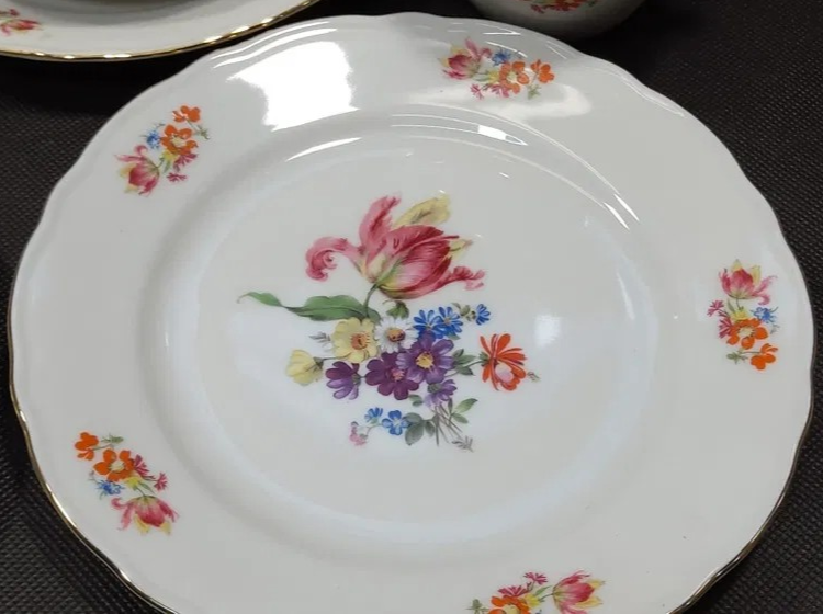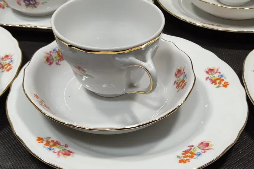 W skład kompletu porcelany wchodzi: dzbanek, podgrzewacz, 2 x cukiernica, 2 x mlecznik, paterka, 12 x filiżanka, 12 x spodek, 12 x talerzyk deserowy.
