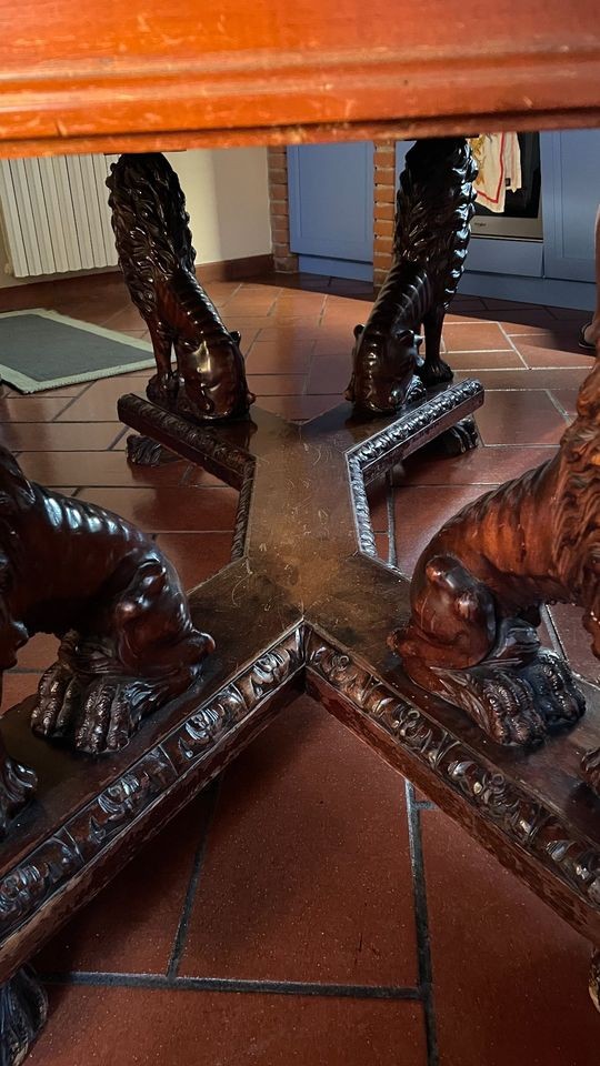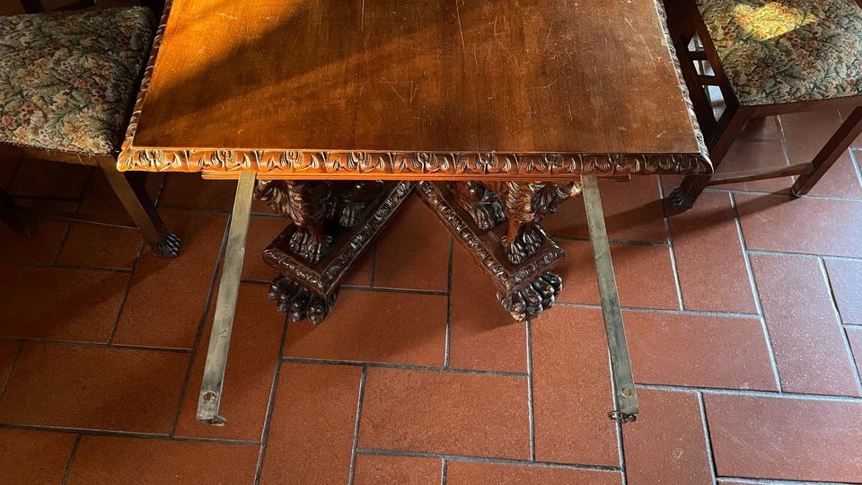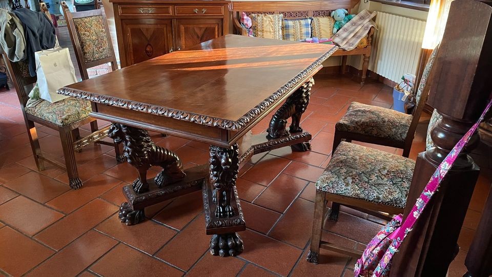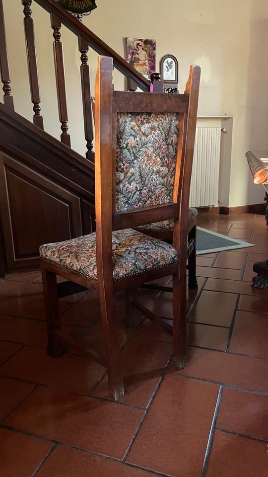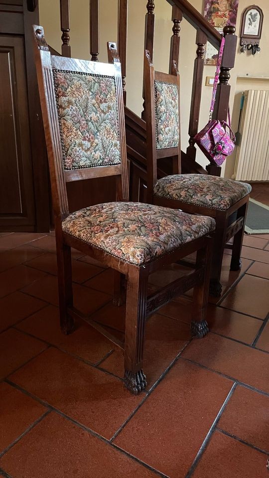 W skład kompletu z drewna orzechowego wchodzi: rozkładany stół, 6 x krzesło.
