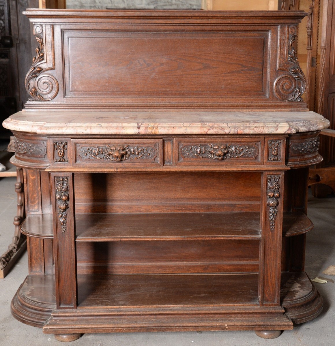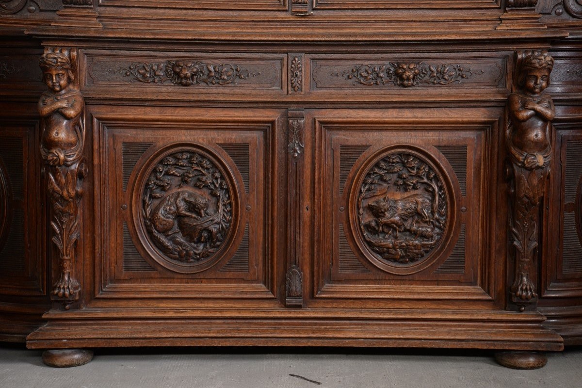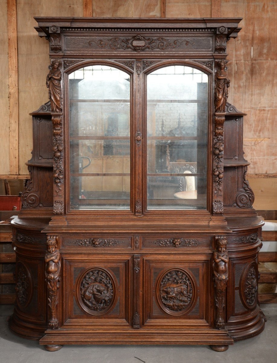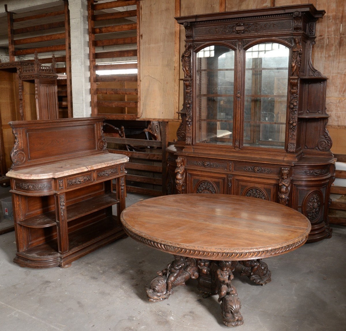 W skład kompletu z drewna dębowego wchodzi: kredens, pomocnik, stół.