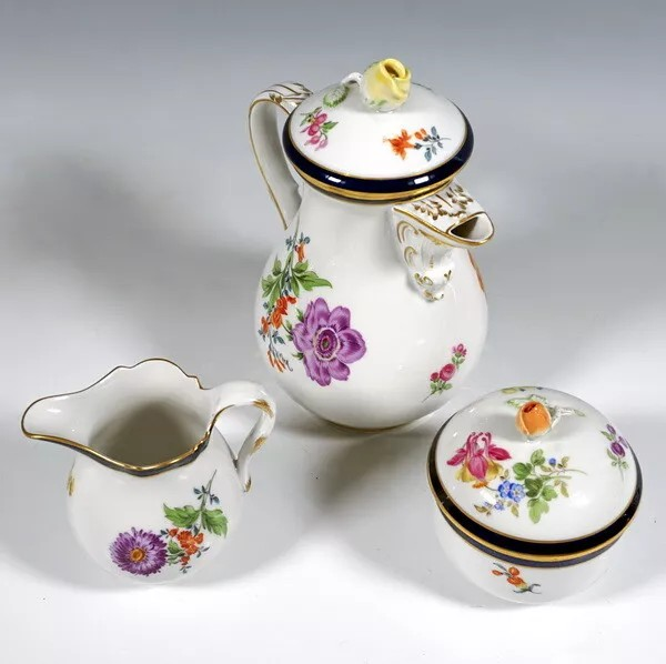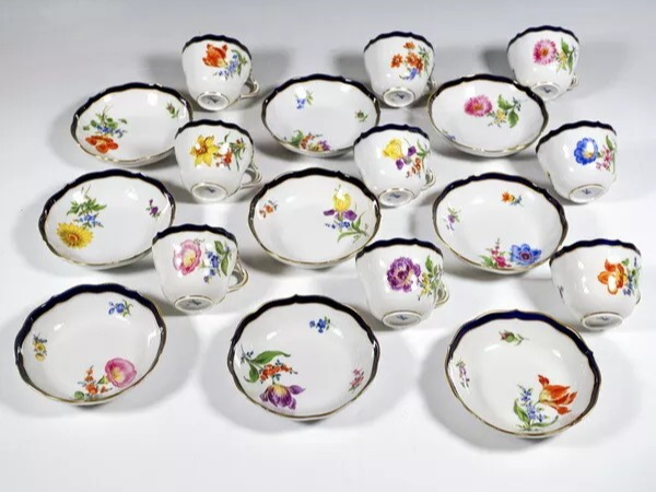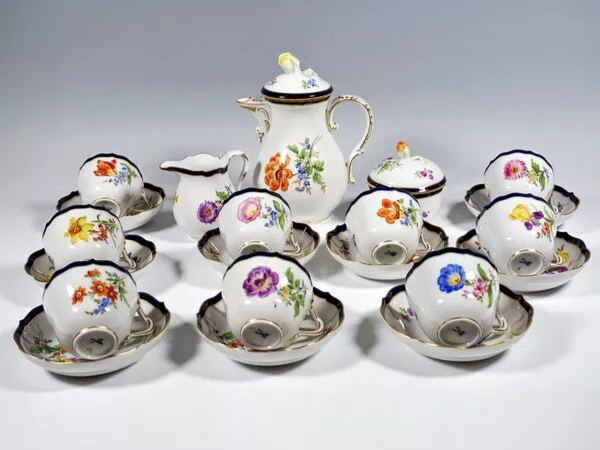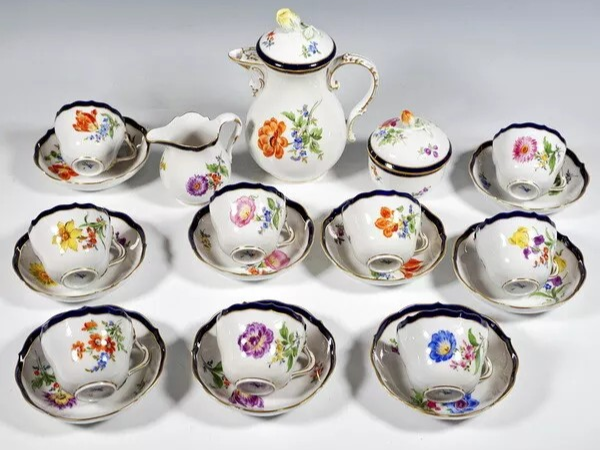 W skład kompletu porcelany miśnieńskiej wchodzi: 9 x filiżanka, 9 x spodek, dzbanek na kawę, mlecznik, cukierniczka.