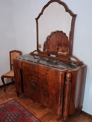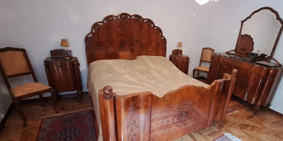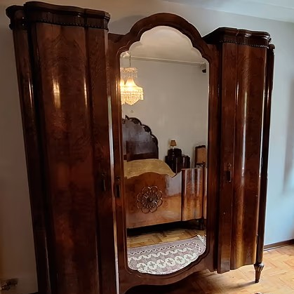 W skład kompletu wchodzi: łoże, szafa z lustrem, komoda z lustrem, 2 x szafka nocna z lampą, 2 x krzesło.
