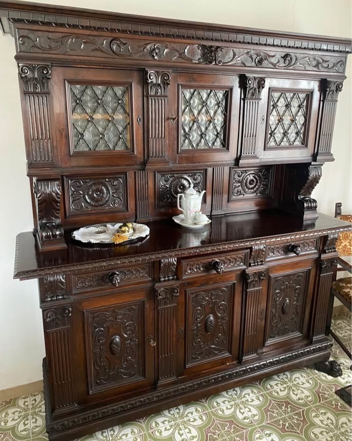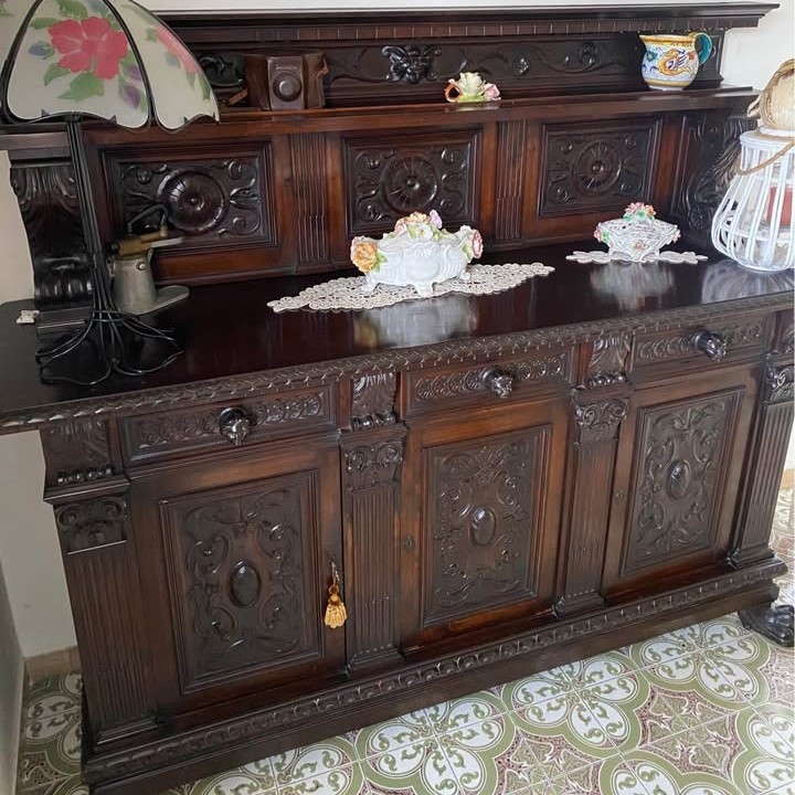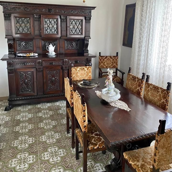 W skład kompletu z drewna wchodzi: kredens, pomocnik, rozkładany stół, fotel, 6 x krzesło.