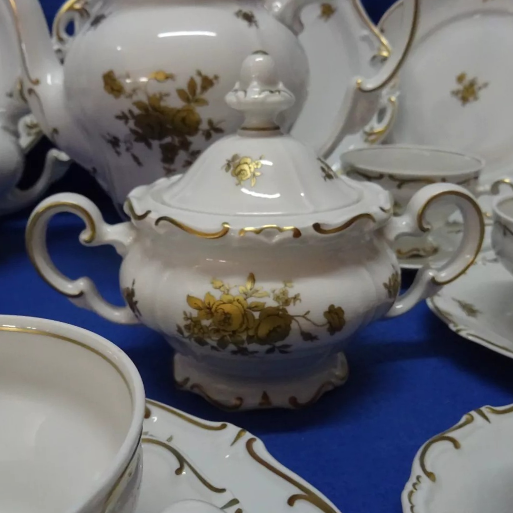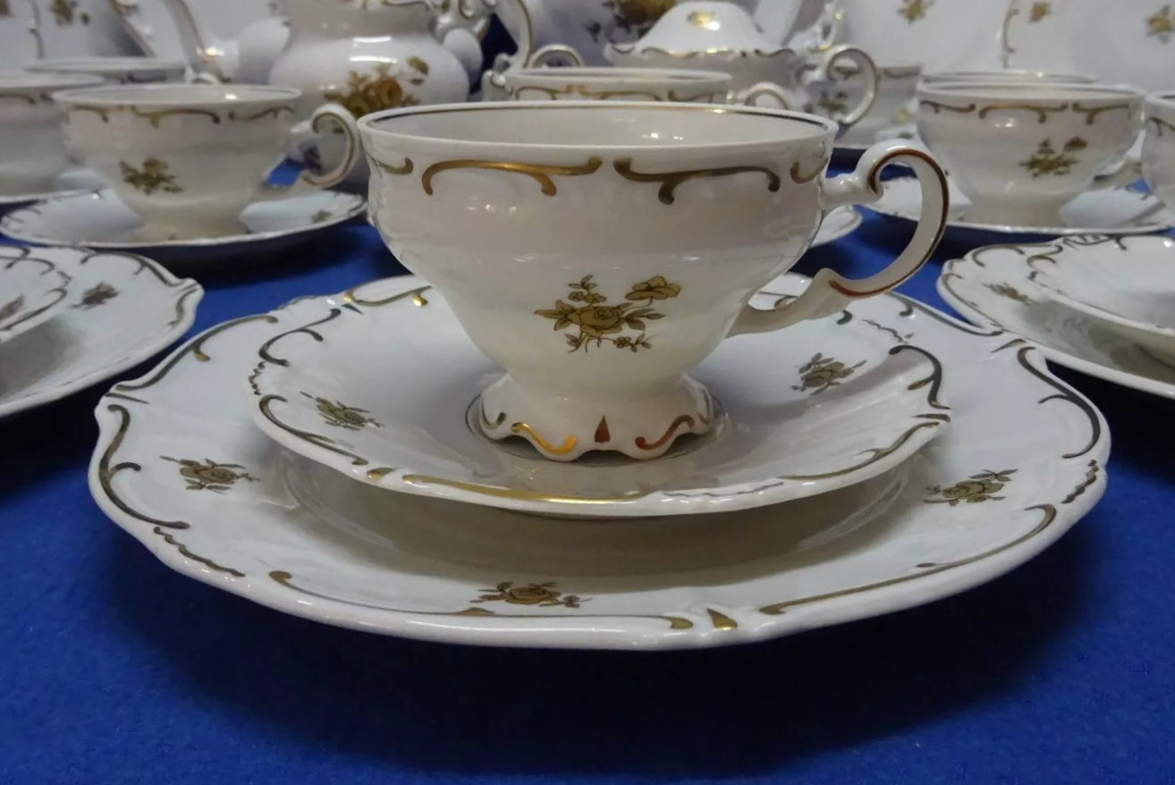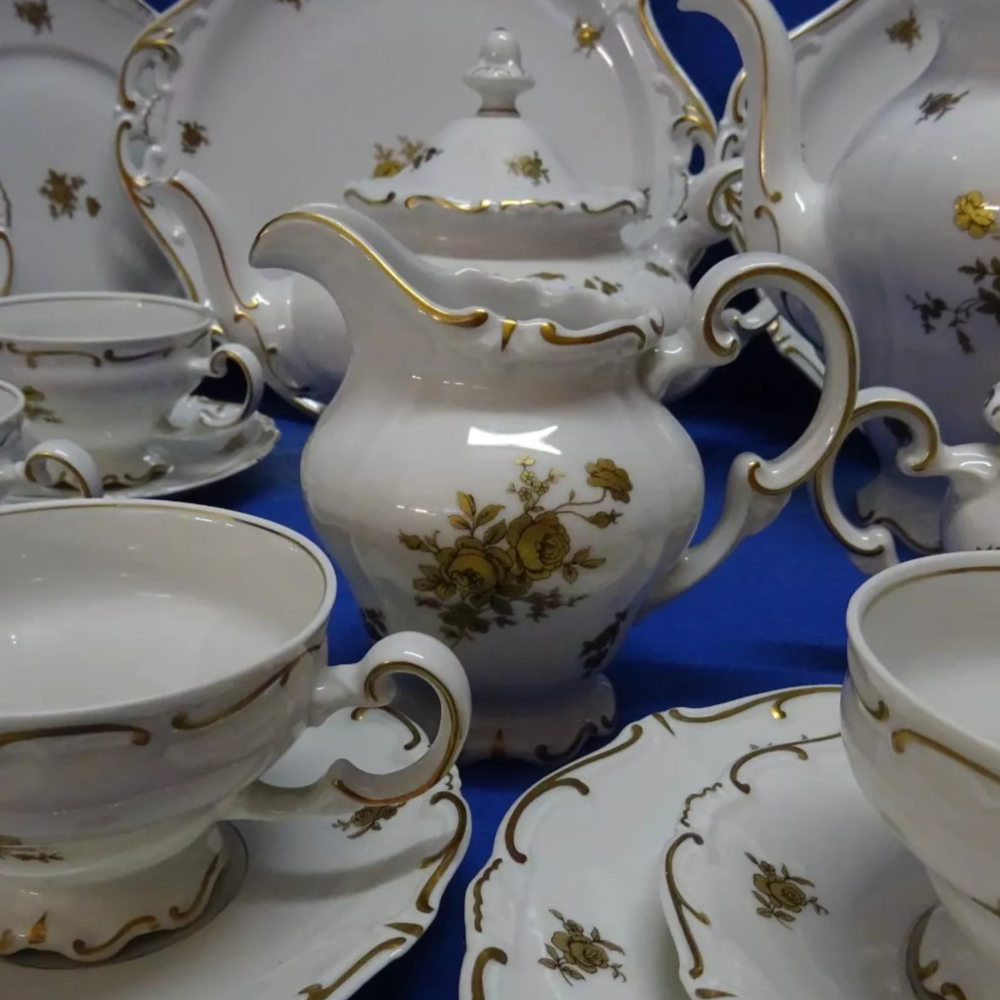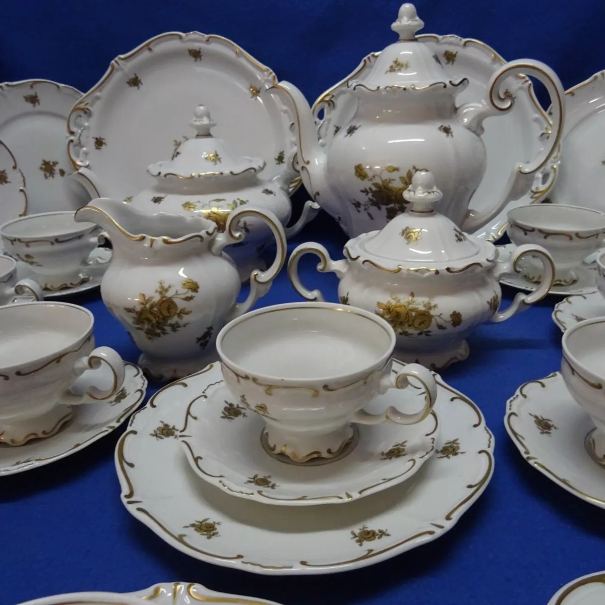 W skład kompletu porcelany wchodzi: 12 x filiżanka, 12 x spodek, 12 x talerzyk deserowy, dzbanek, imbryk, mlecznik, cukiernica, 2 x talerz na ciasto.