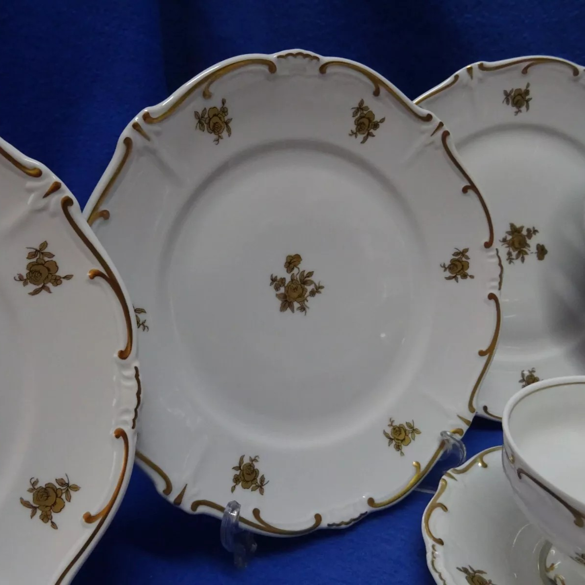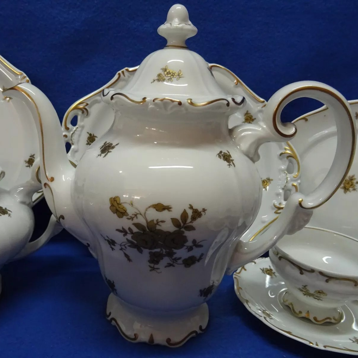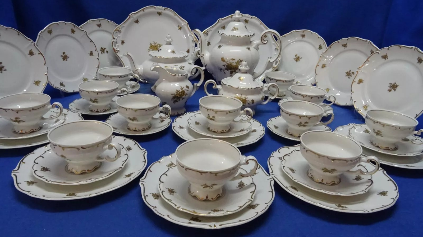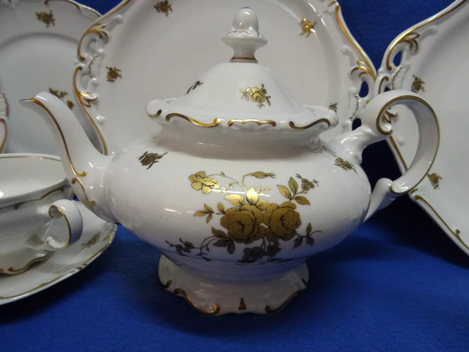 W skład kompletu porcelany wchodzi: 12 x filiżanka, 12 x spodek, 12 x talerzyk deserowy, dzbanek, imbryk, mlecznik, cukiernica, 2 x talerz na ciasto.