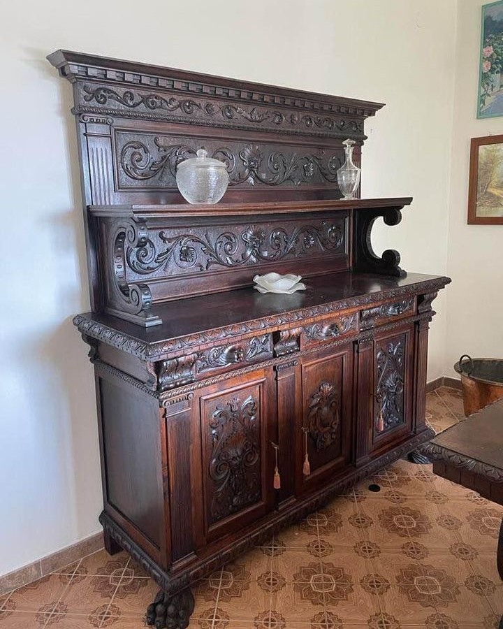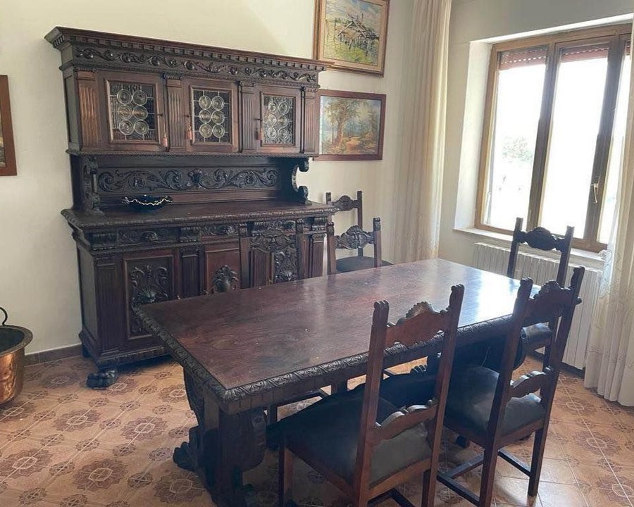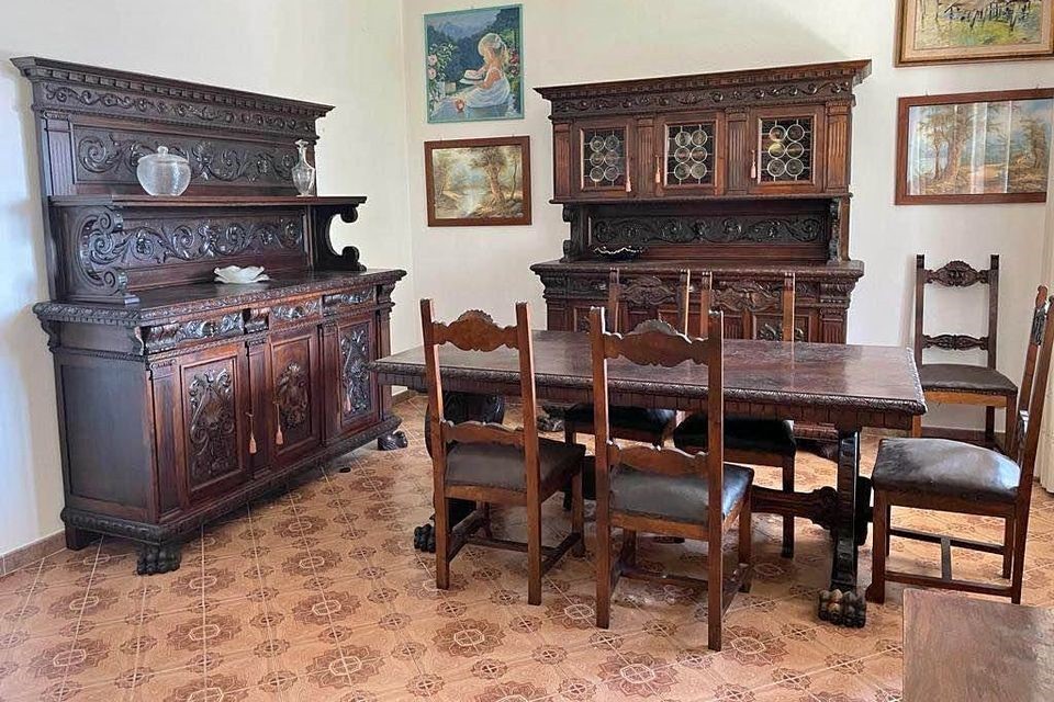 W skład kompletu z drewna orzechowego wchodzi: kredens, pomocnik, stół, 6 x krzesło.