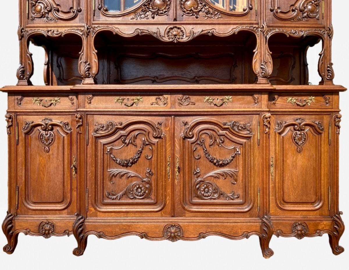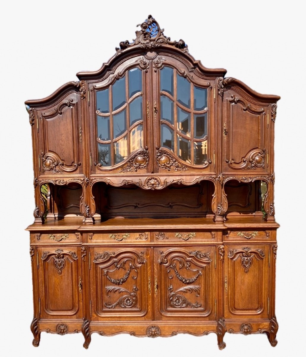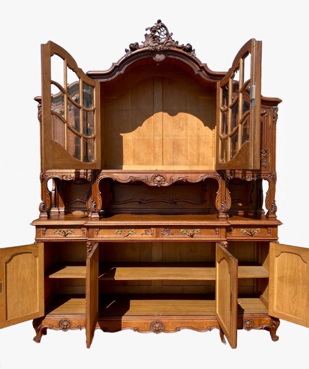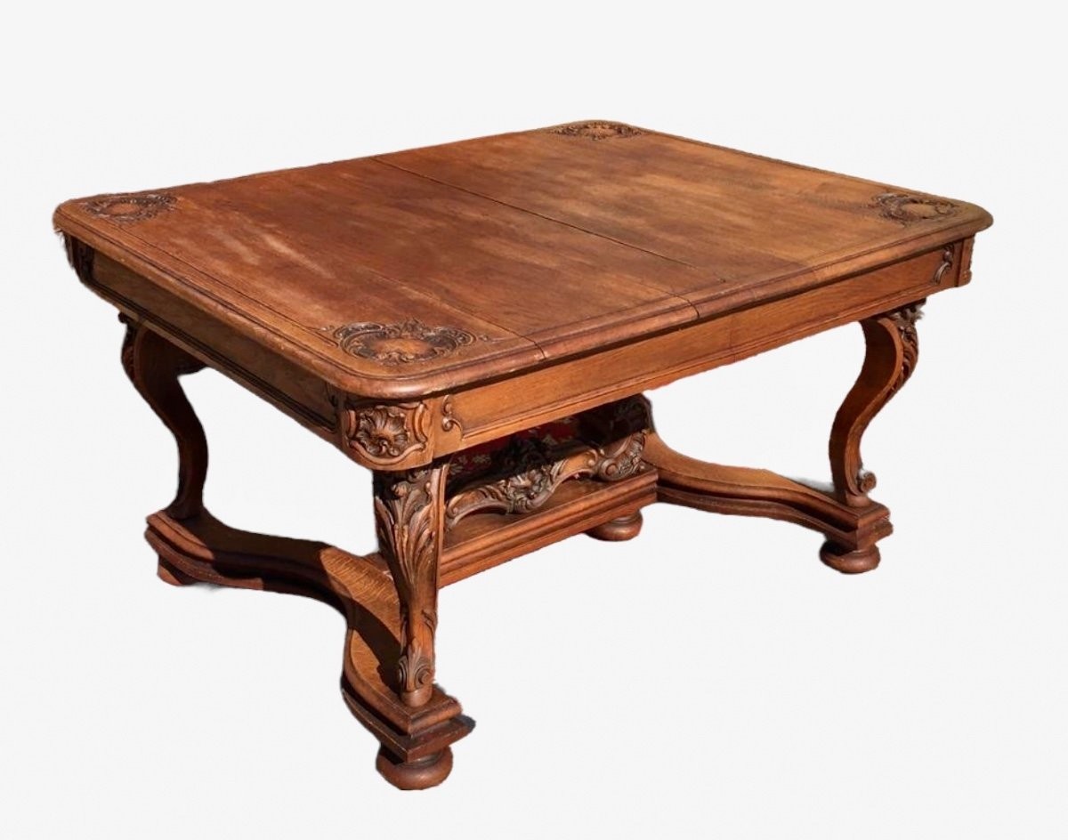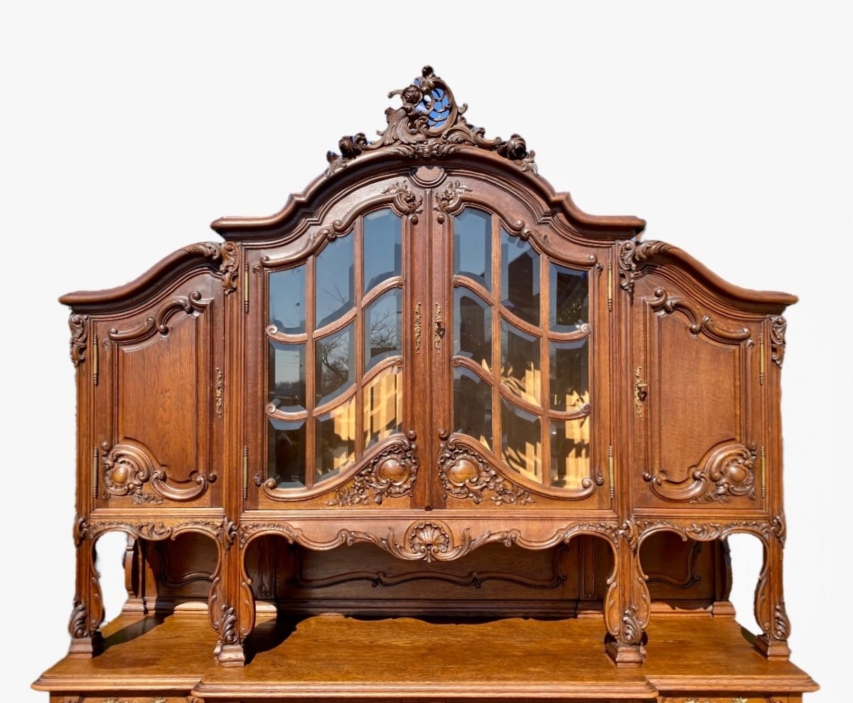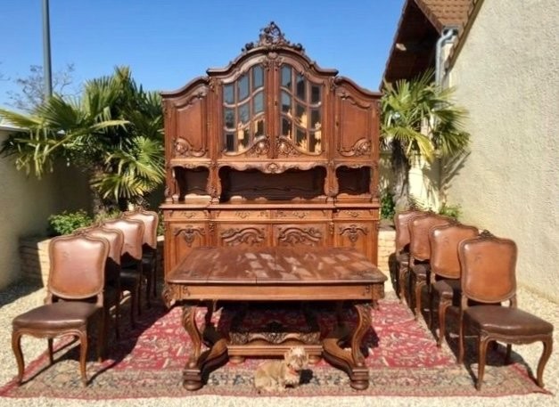 W skład kompletu z drewna dębowego wchodzi: kredens, stół, 8 x krzesło.