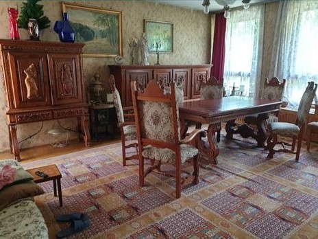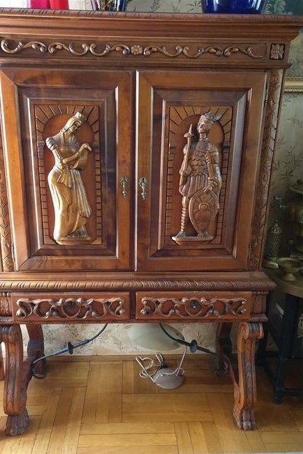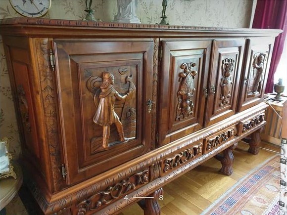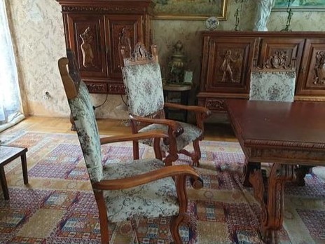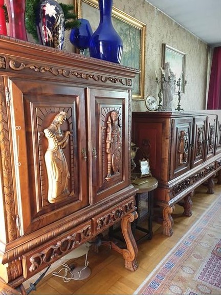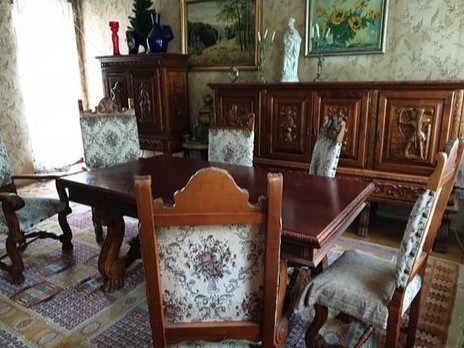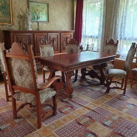 W skład kompletu z drewna dębowego wchodzi: szafka, szafka bufetowa, rozkładany stół, 2 x fotel, 4 x krzesło.