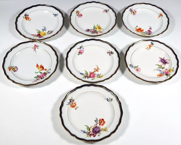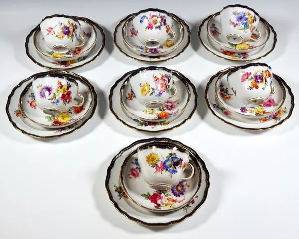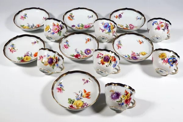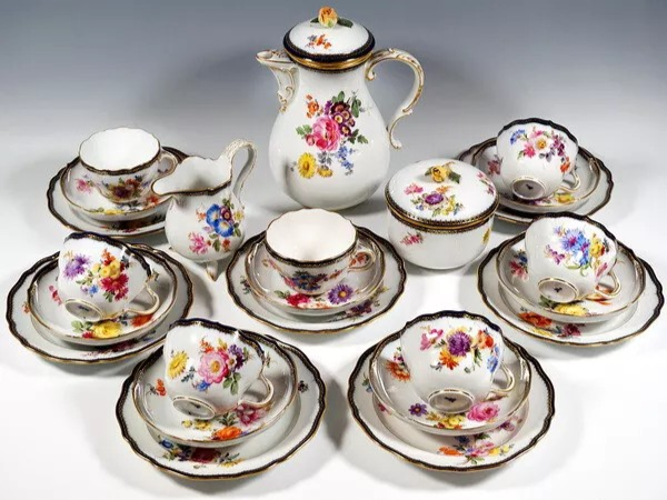 W skład kompletu porcelany miśnieńskiej wchodzi: dzbanek, mlecznik, cukiernica, 7 x filiżanka, 7 x spodek, 7 x talerzyk deserowy.