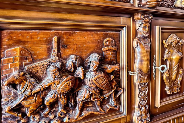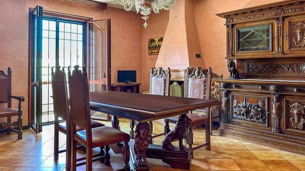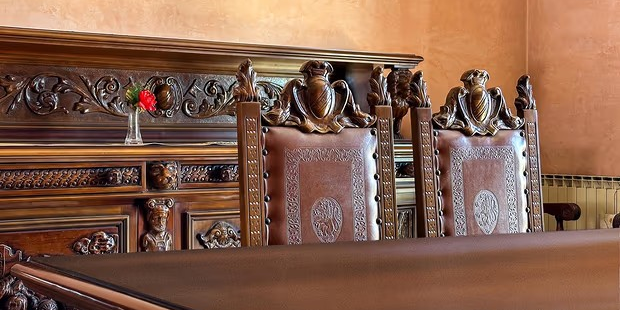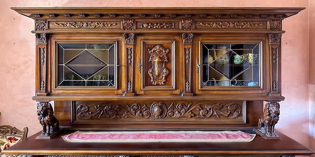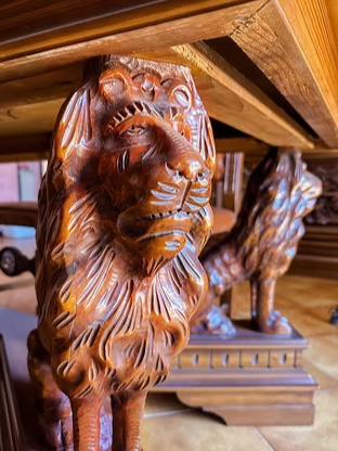 W skład kompletu z drewna orzechowego wchodzi: kredens, pomocnik, stół (220 cm x 100 cm), krzesła.