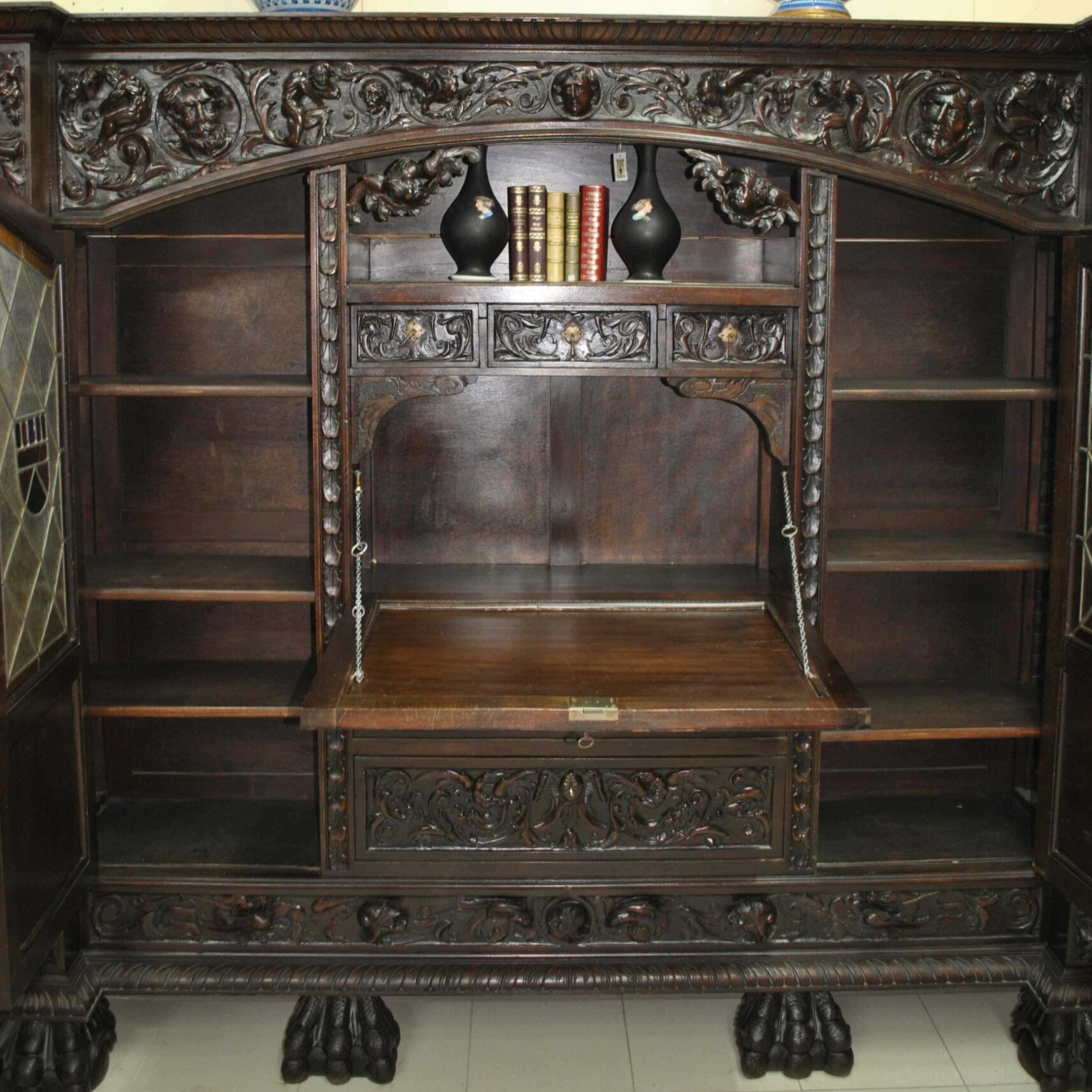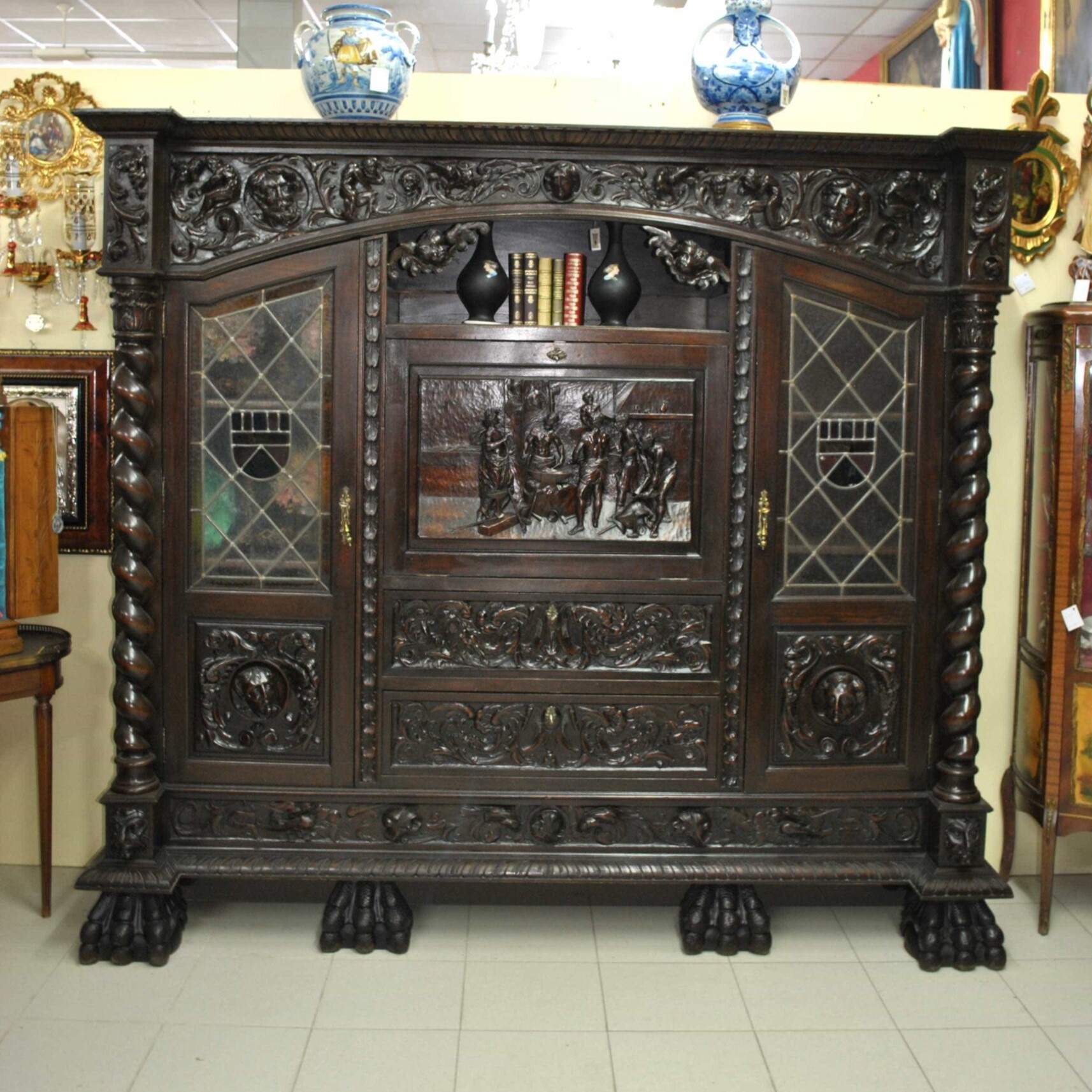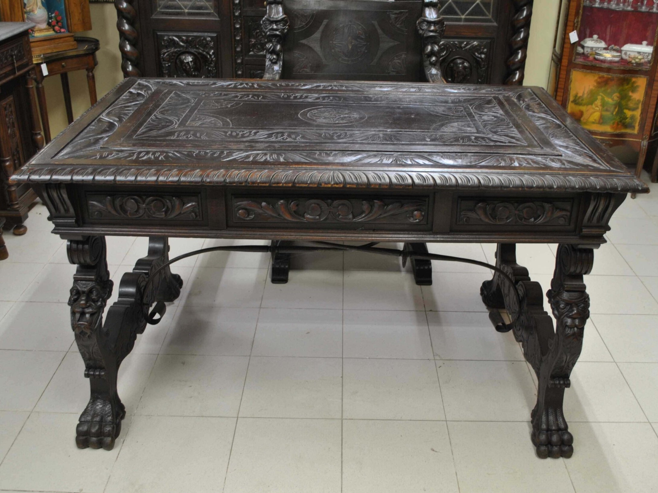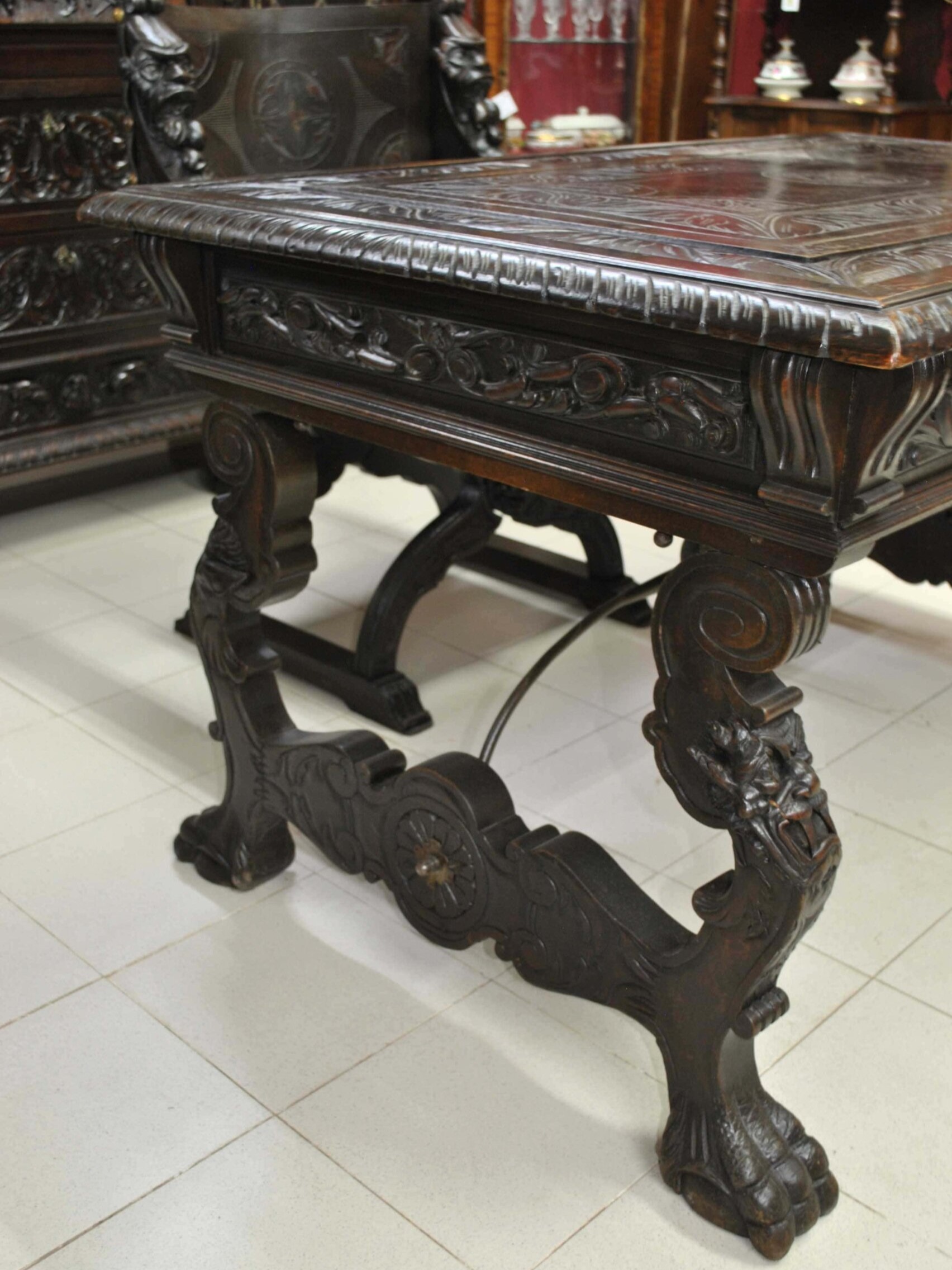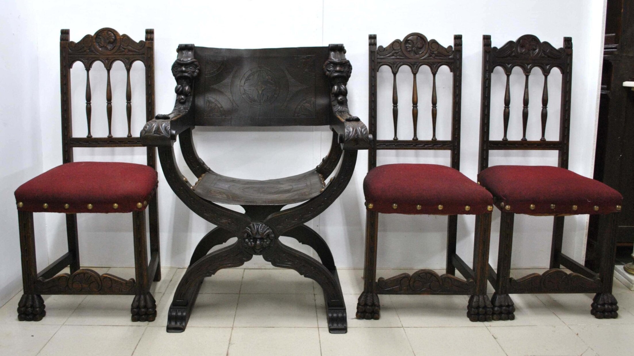 W skład kompletu wchodzi: biblioteka (z rzeźbieniami przedstawiającymi Kuźnię Wulkana), biurko, fotel, 3 x krzesło.