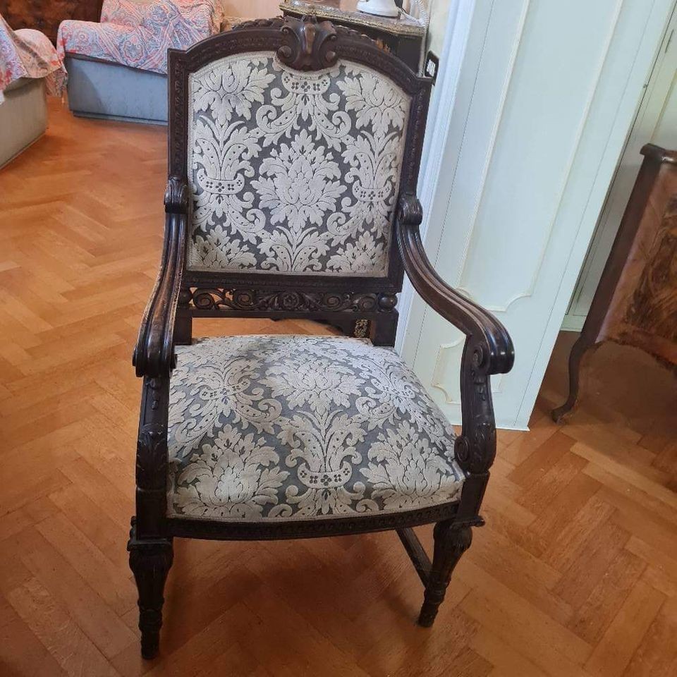 W skład kompletu wchodzi: 2 x pomocnik, stół, 2 x krzesło z podłokietnikami, krzesła.
