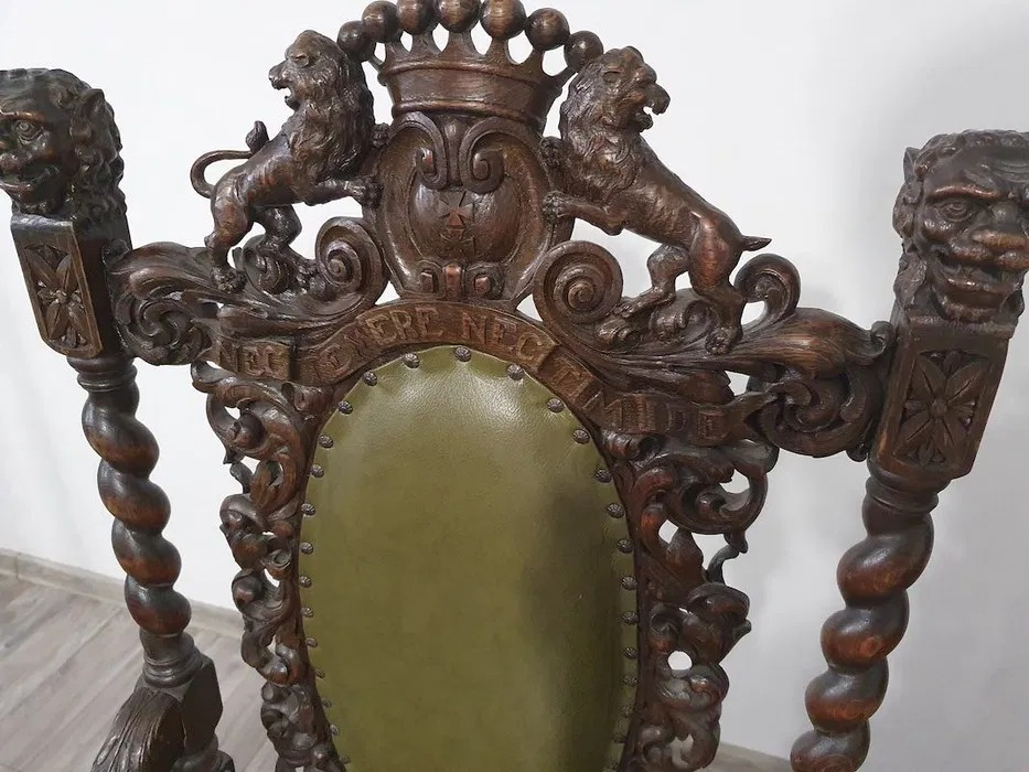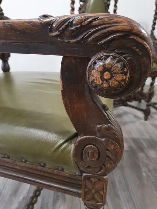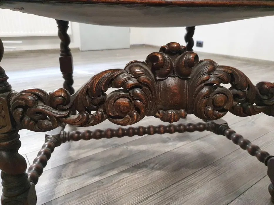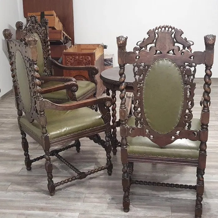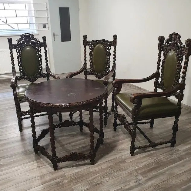 W skład kompletu mebli gdańskich z drewna dębowego wchodzi: stolik do kawy, 3 x krzesło.