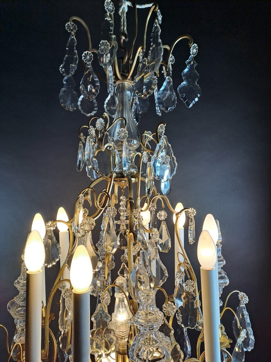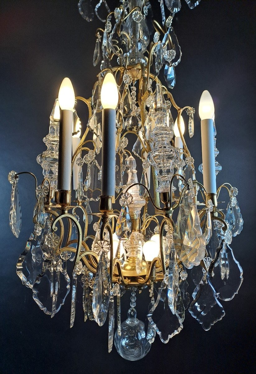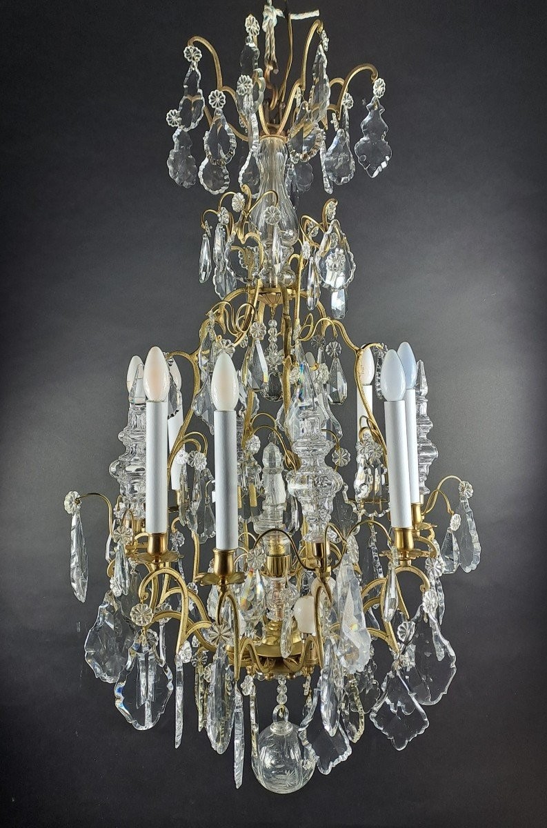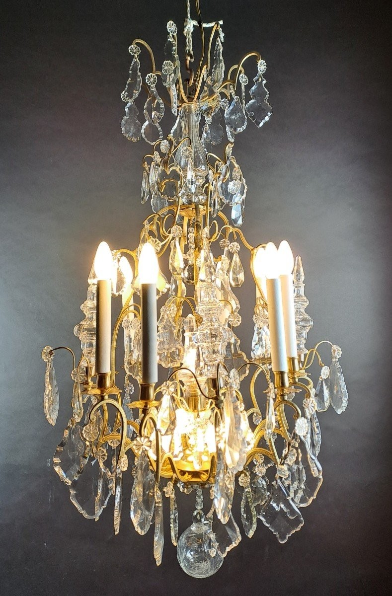 Duży żyrandol ze złoconego brązu. Lampa składa się z 8 lamp na zewnątrz i 5 w środku. Przedmiot z drugiej połowy XIX wieku.