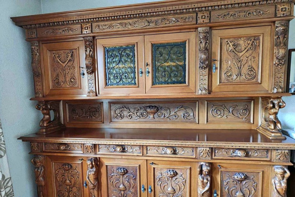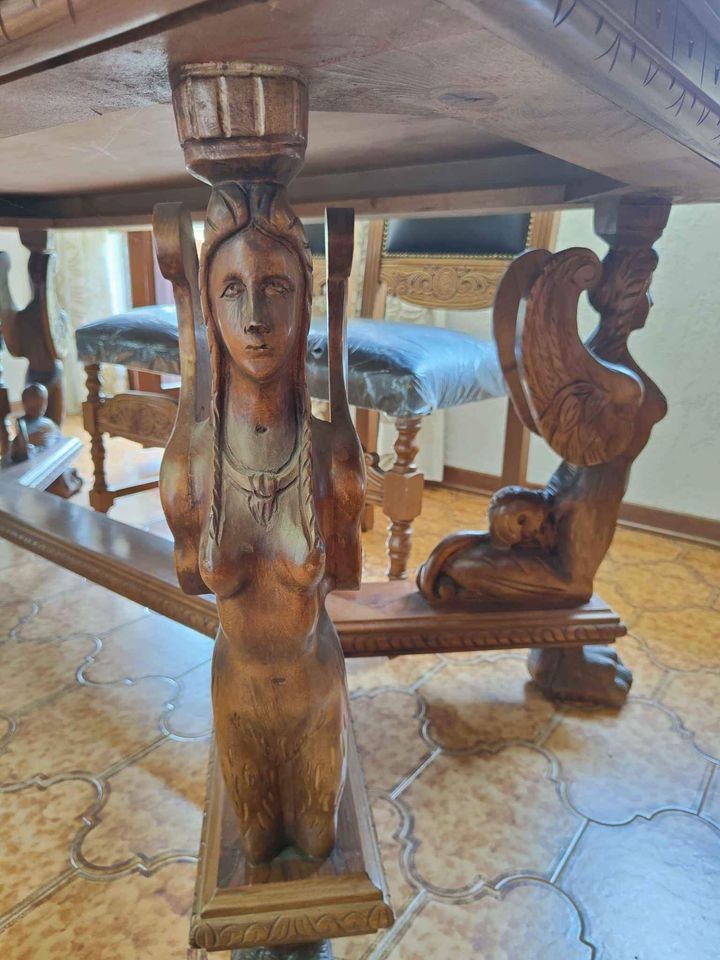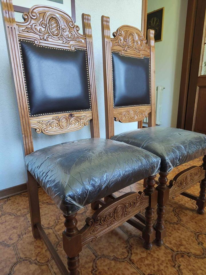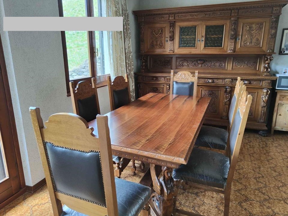W skład kompletu z orzecha włoskiego wchodzi: kredens, stół, 6 x krzesło.