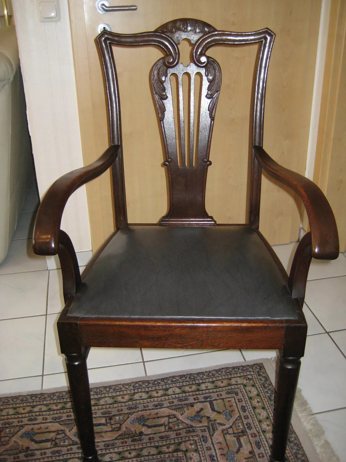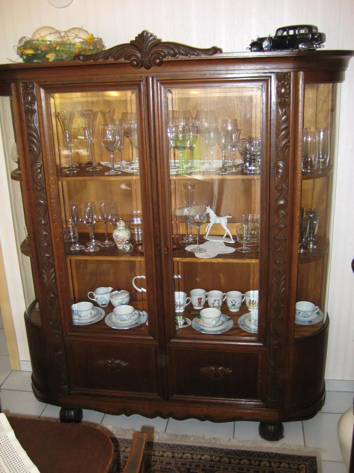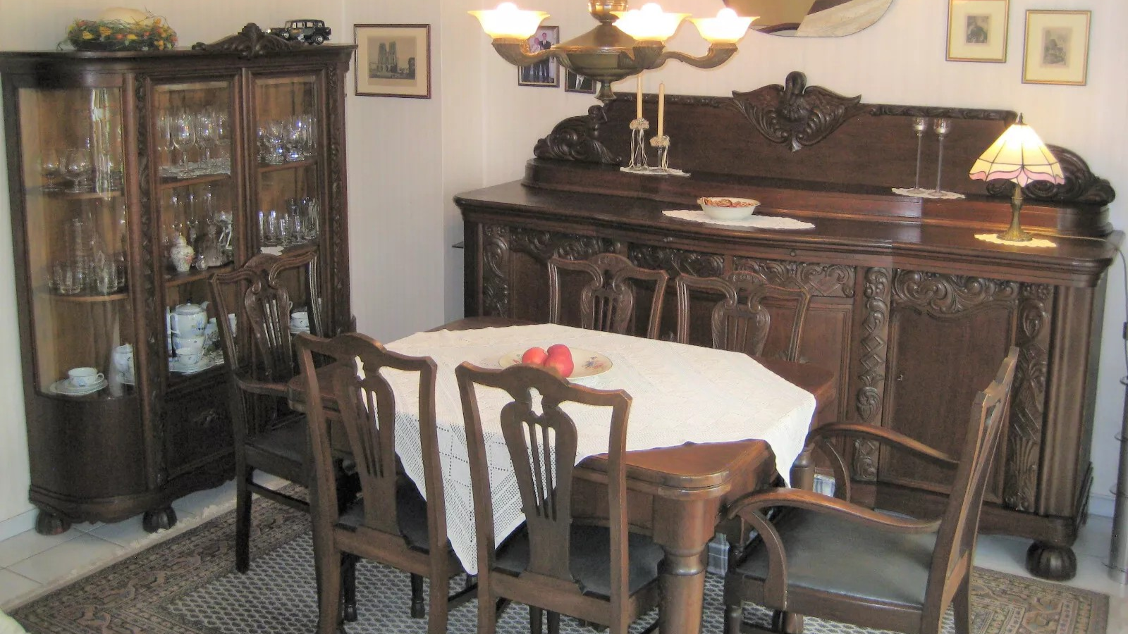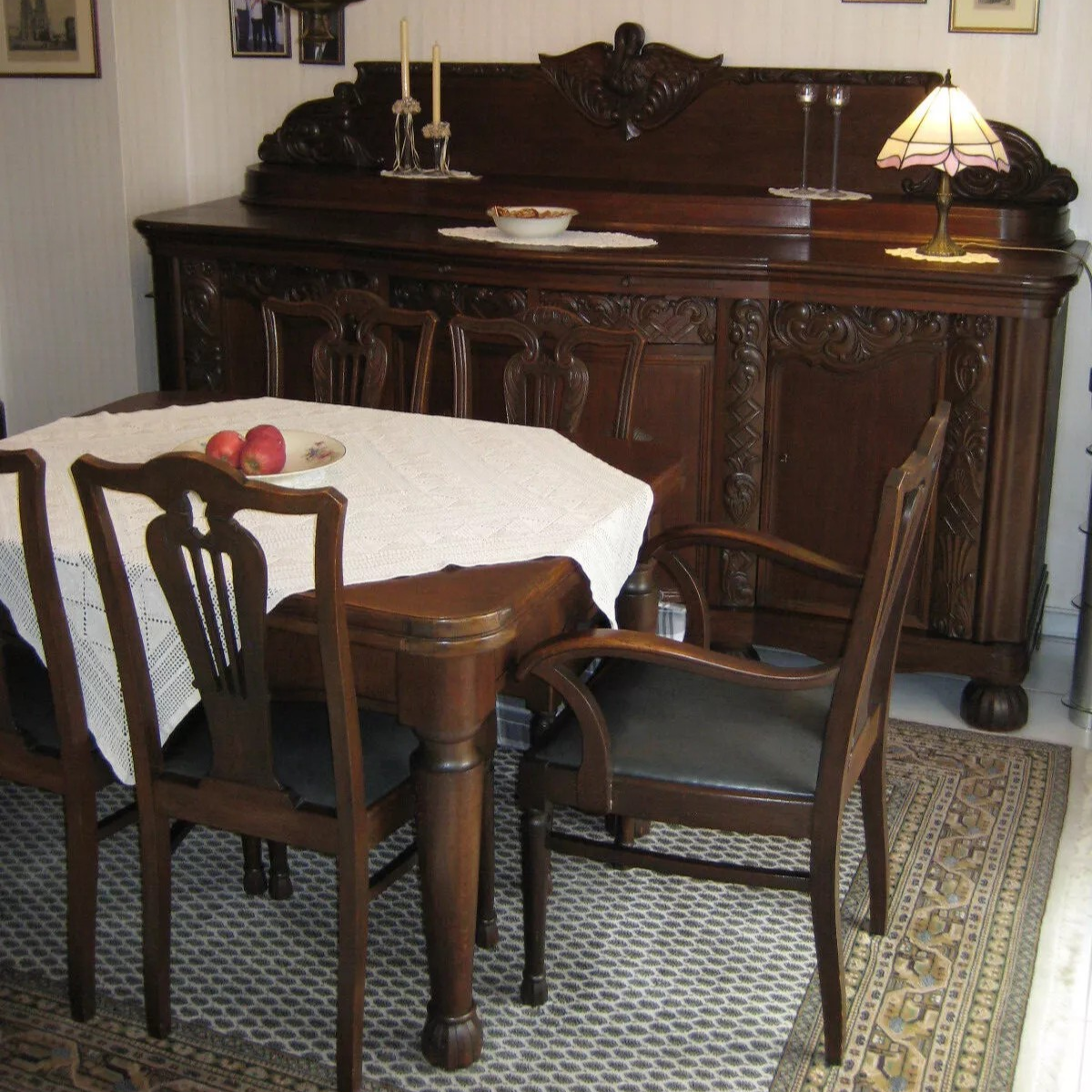 W skład kompletu z drewna dębowego wchodzi: gablota, pomocnik, rozkładany stół, 2 x krzesło z podłokietnikami, 4 x krzesło, stolik boczny, żyrandol.