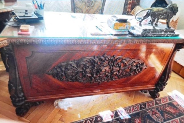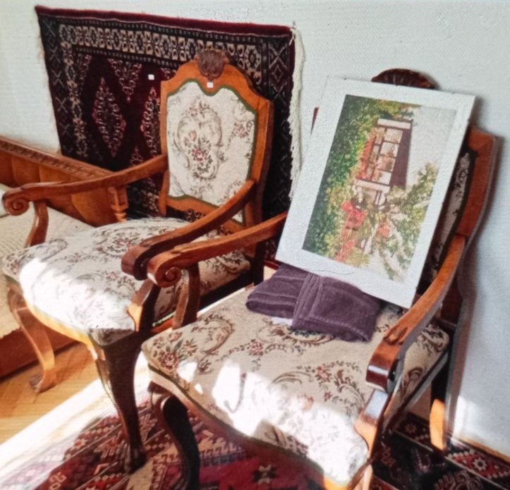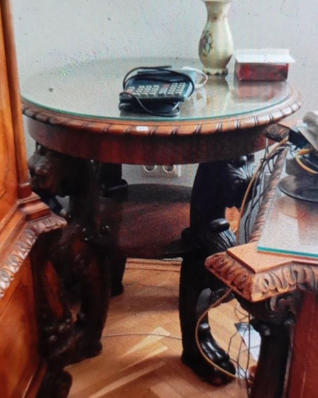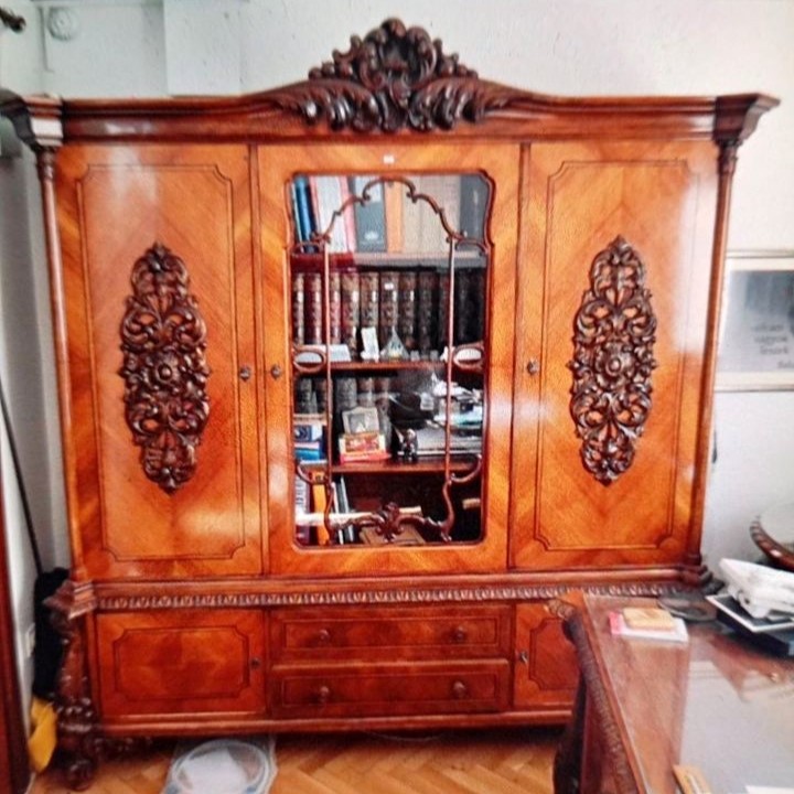 W skład kompletu wchodzi: biblioteka, biurko, stół, 3 x fotel.