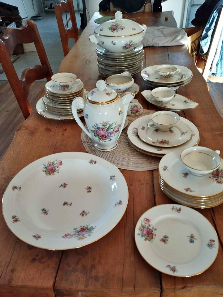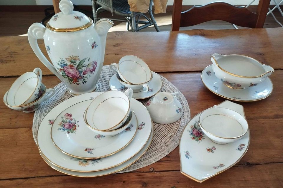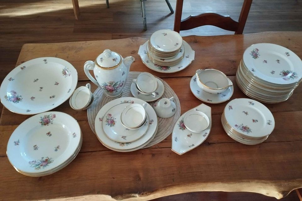 W skład kompletu porcelany wchodzi: dzbanek, 6 x filiżanka, 6 x spodek, waza do zupy, 3 x głęboki talerz, 12 x płaski talerz, 12 x talerzyk deserowy, sosjerka, naczynie płaskie i owalne.