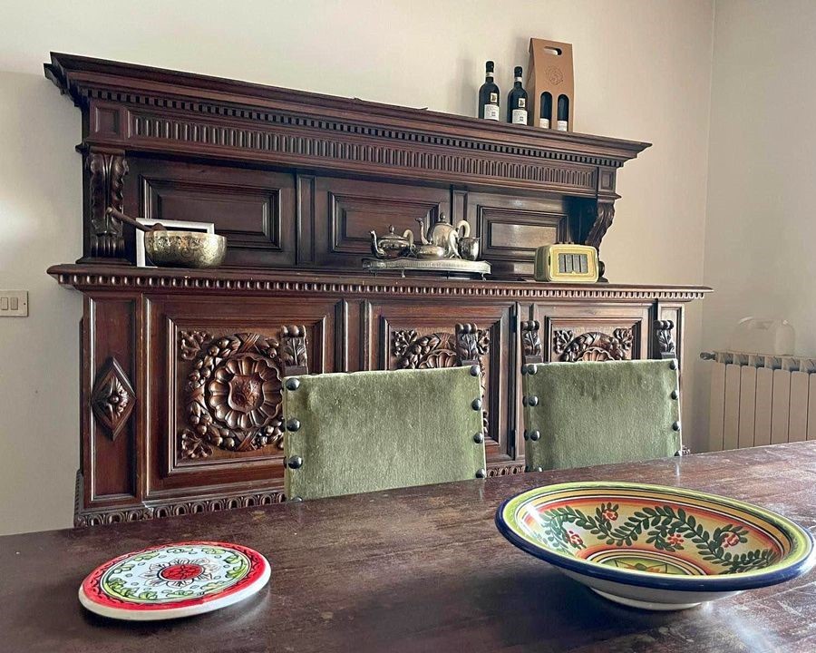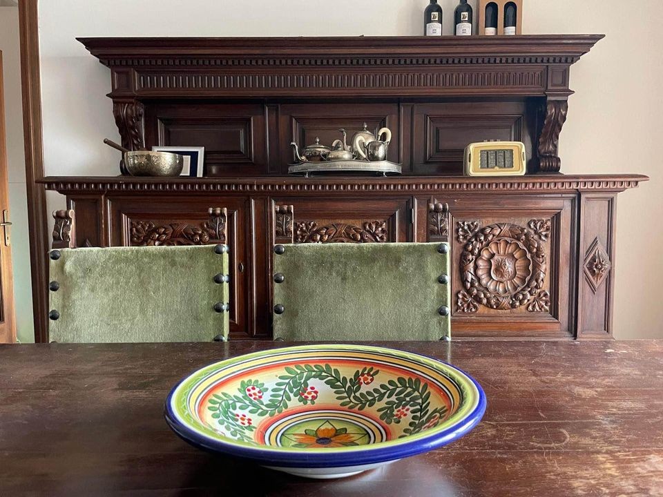 W skład kompletu wchodzi: 2 x kredens, stół.