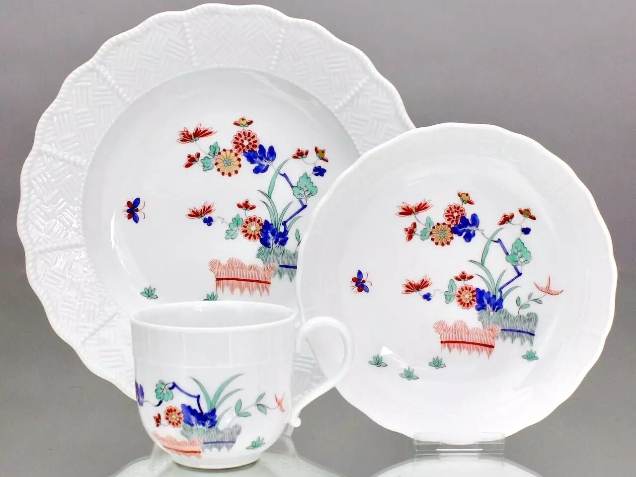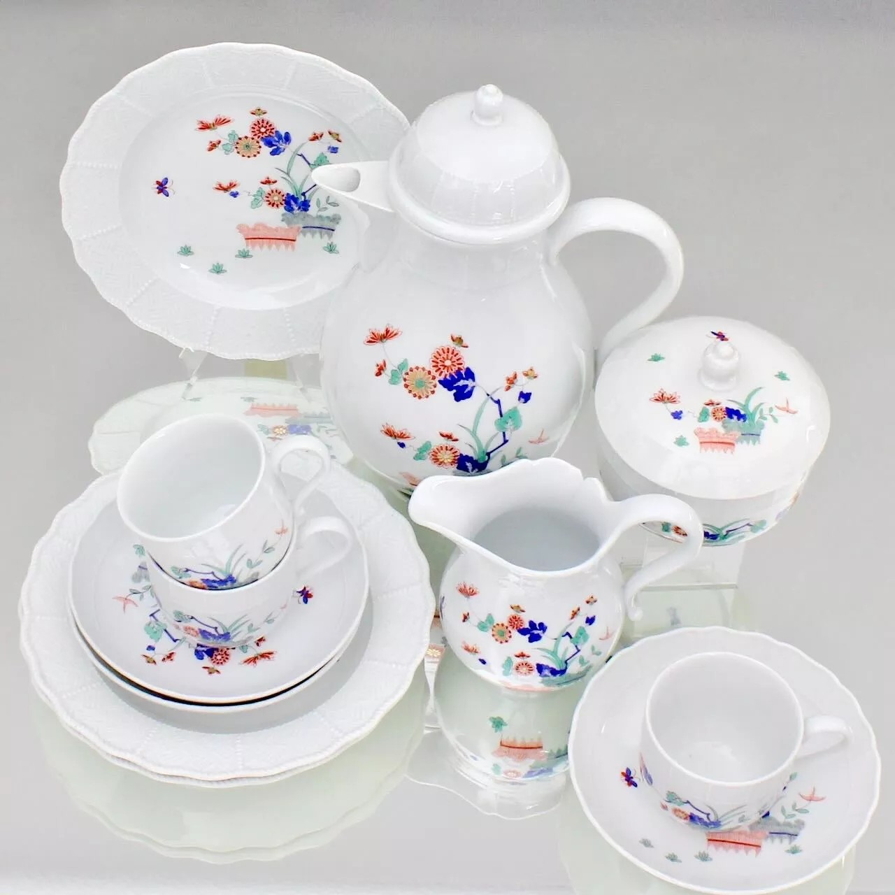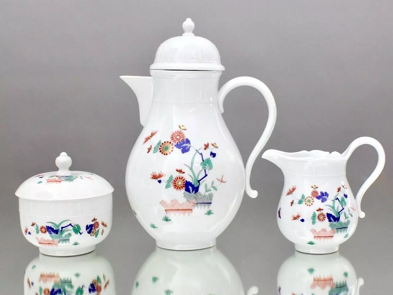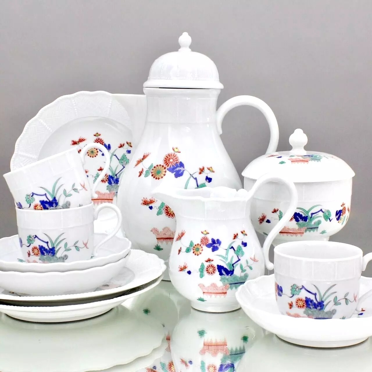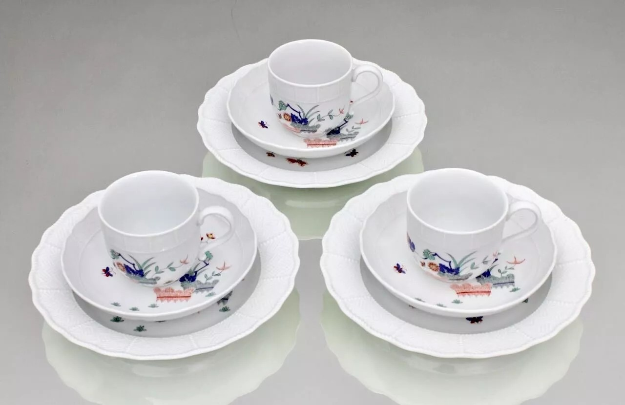 W skład kompletu porcelany miśnieńskiej wchodzi: dzbanek, cukiernica, mlecznik, 3 x filiżanka, 3 x spodek, 3 x talerzyk deserowy.