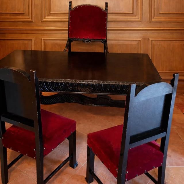 W skład kompletu wchodzi: biblioteka, biurko, fotel, 2 x krzesło, szafka.