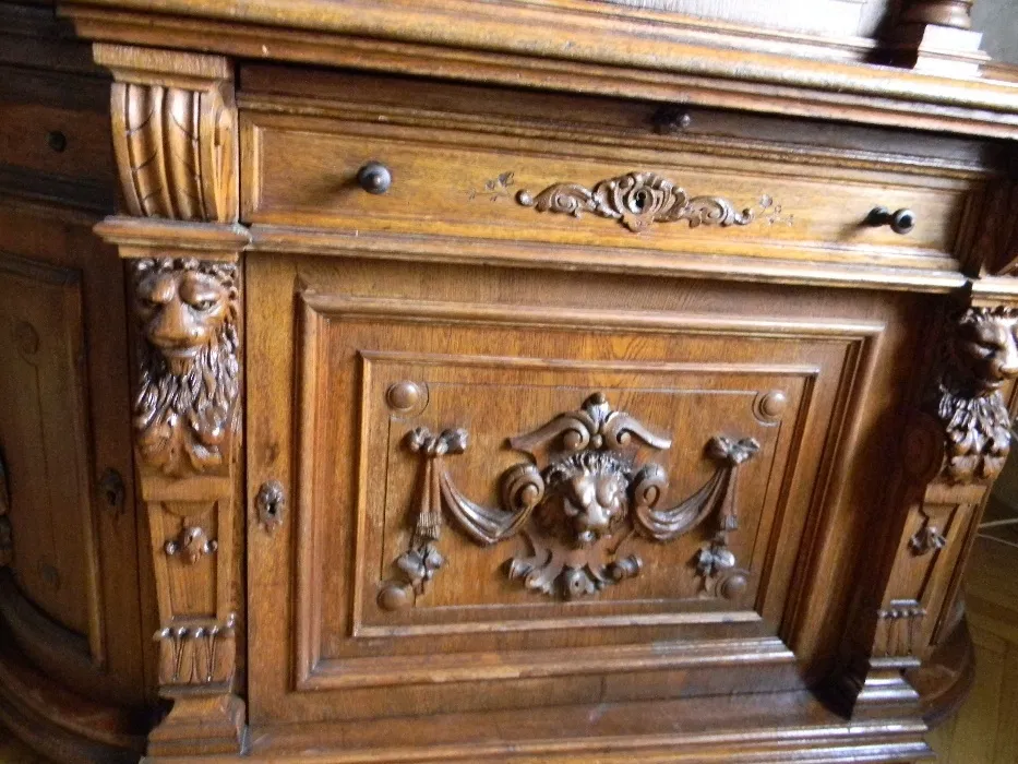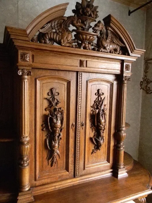 Wspaniały dębowy kredens z XIX wieku. Na drzwiczkach motywy myśliwskie.