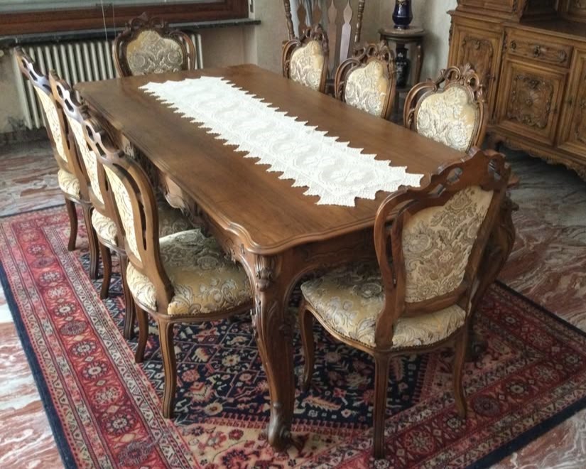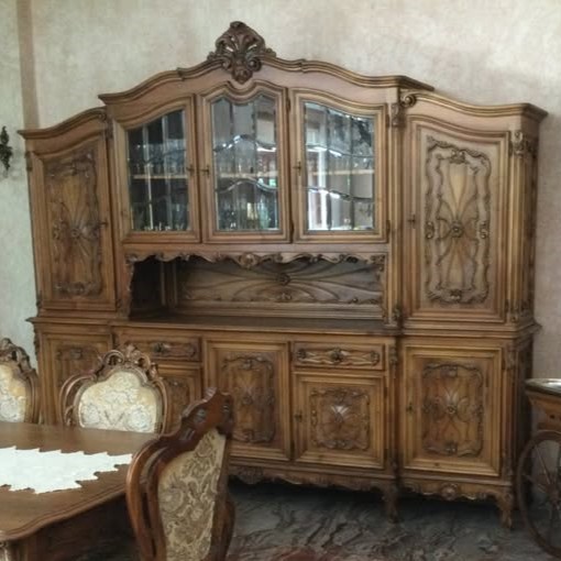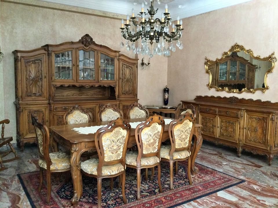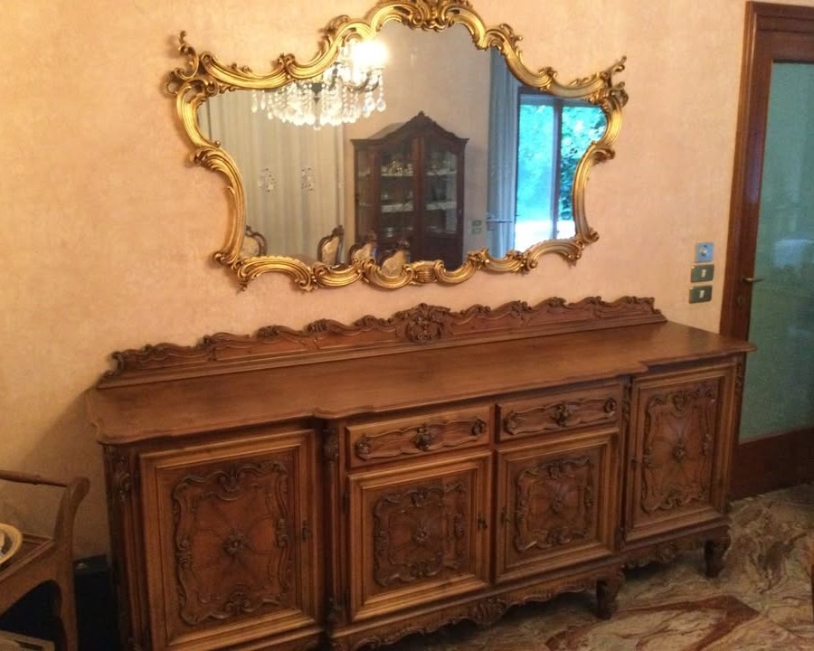 W skład kompletu wchodzi: kredens, bufet z lustrem, stół, krzesła, żyrandol.