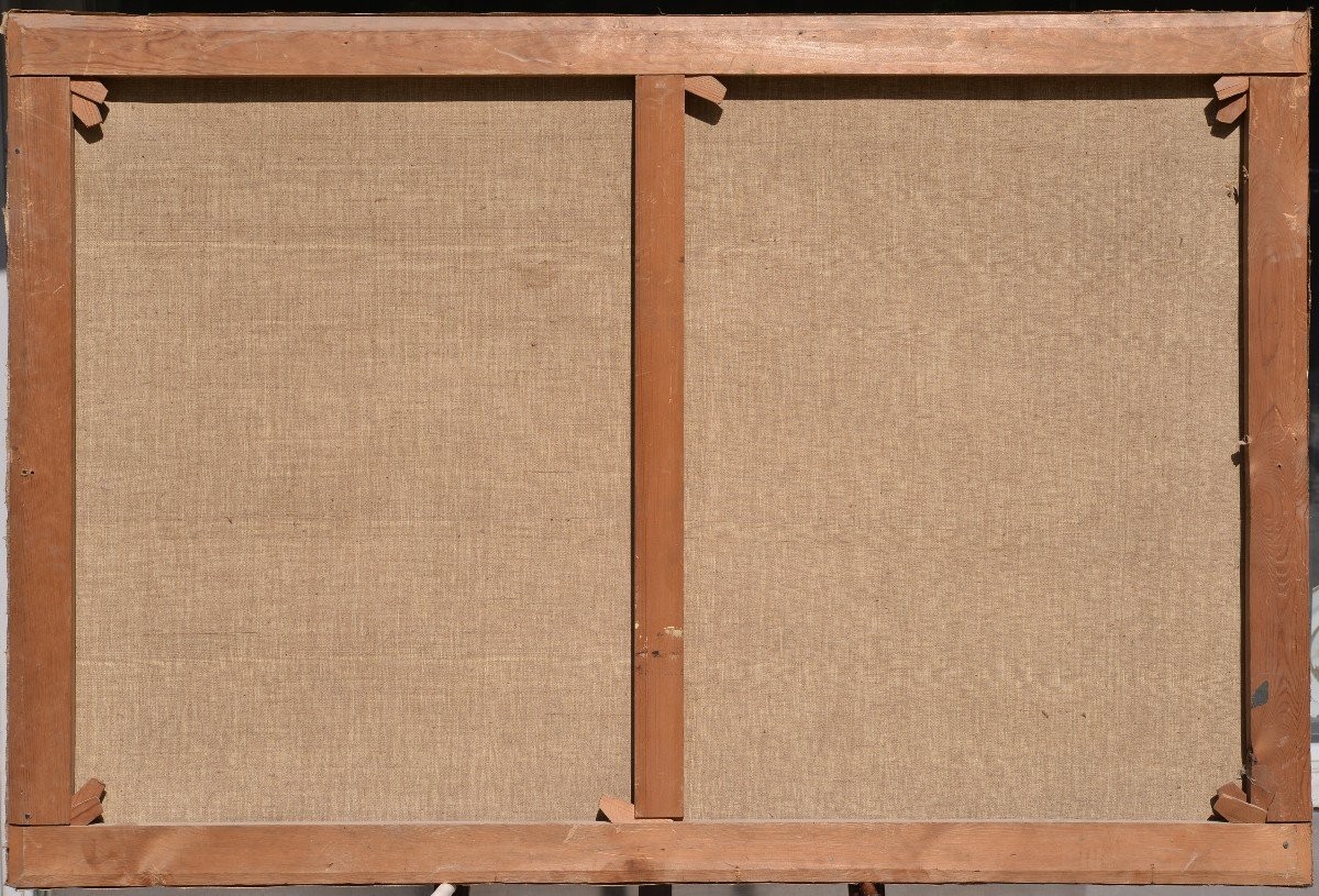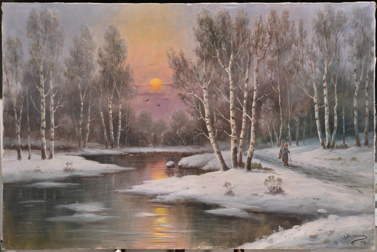 S2905 Zachód słońca w zimę w lesie, Olej na płótnie, XX w.